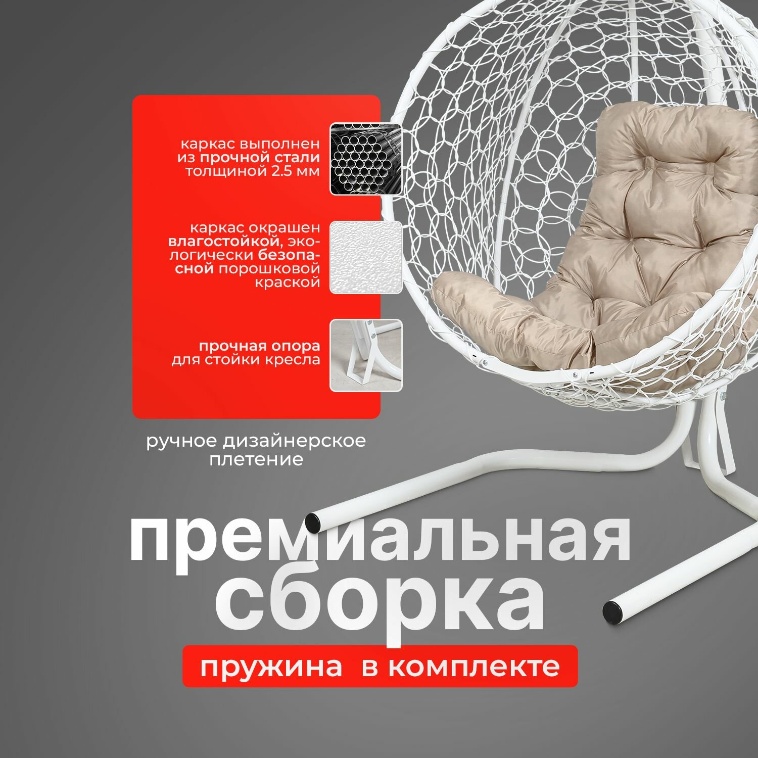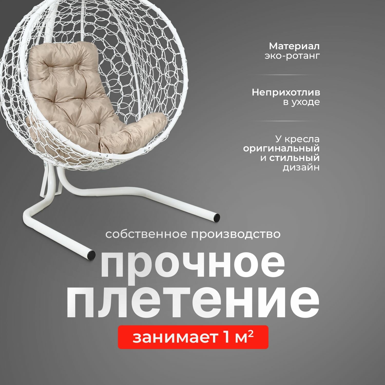 Купить Подвесное кресло кокон садовое 175х105х63см. Усиленная стойка до 200 кг Белый, подушка трапеция Бежевая.