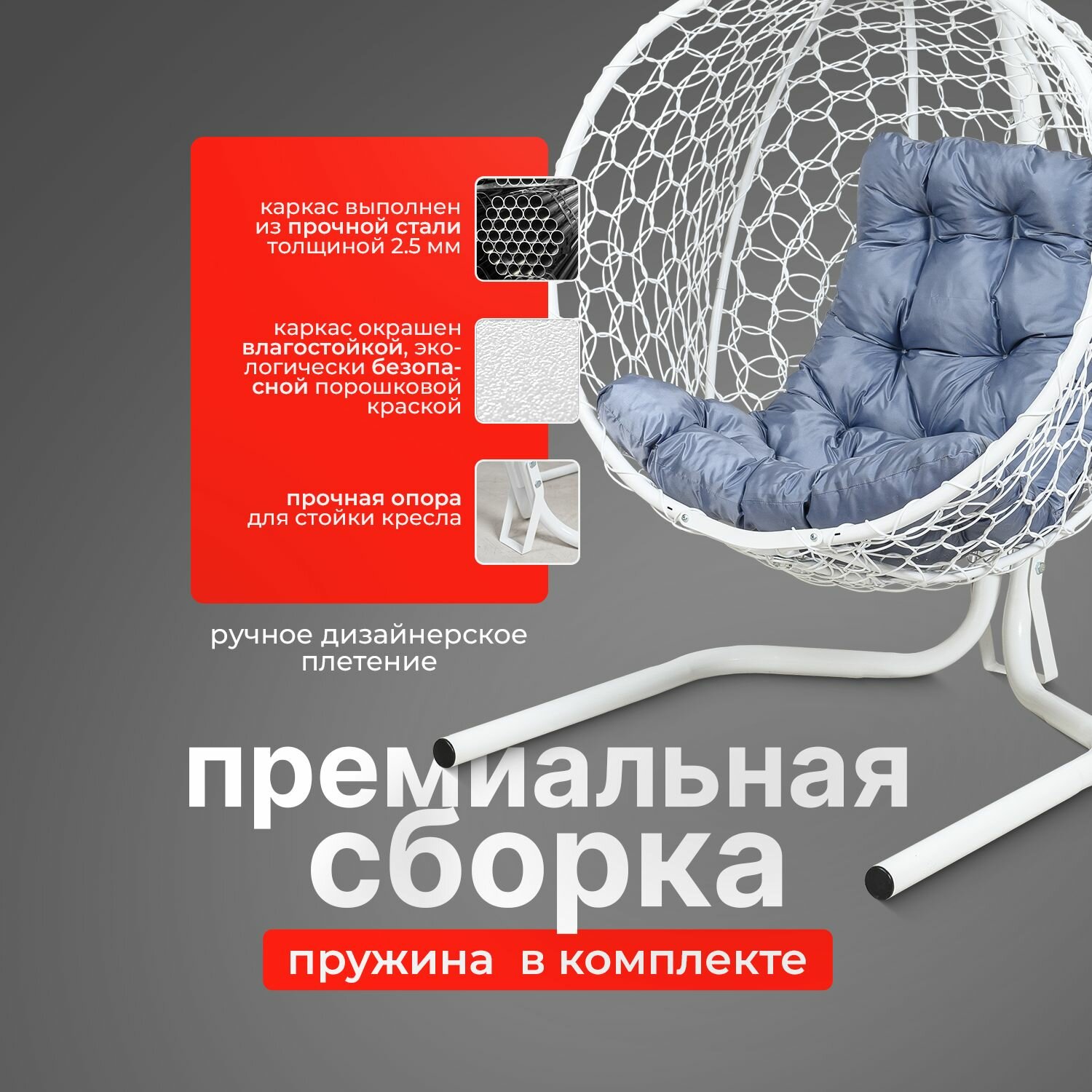 | Комплектация | В комплект входит: 1) Сборно-разборная металлическая стойка. 2) Цельный кокон с плетением Ажур. 3) Подушка в виде трапеции. 4) Комплект креплений с S-образными крючками. Изображения и цвет представленного товара могут незначительно отличаться от оригинала продукции, в зависимости от разрешения и настроек вашего экрана, а также условий освещения при съемке. Производитель оставляет за собой право вносить изменения в конструкцию не ухудшающие изделие. |