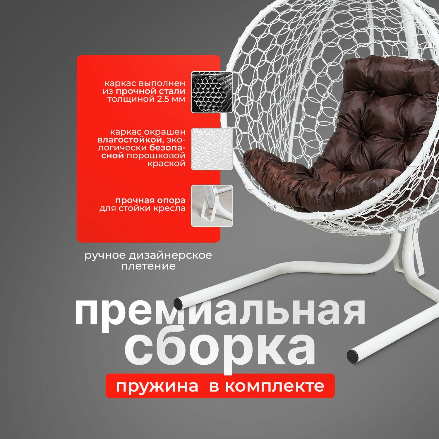 | Комплектация | В комплект входит: 1) Сборно-разборная металлическая стойка. 2) Цельный кокон с плетением Ажур. 3) Подушка в виде трапеции. 4) Комплект креплений с S-образными крючками. Изображения и цвет представленного товара могут незначительно отличаться от оригинала продукции, в зависимости от разрешения и настроек вашего экрана, а также условий освещения при съемке. Производитель оставляет за собой право вносить изменения в конструкцию не ухудшающие изделие. |