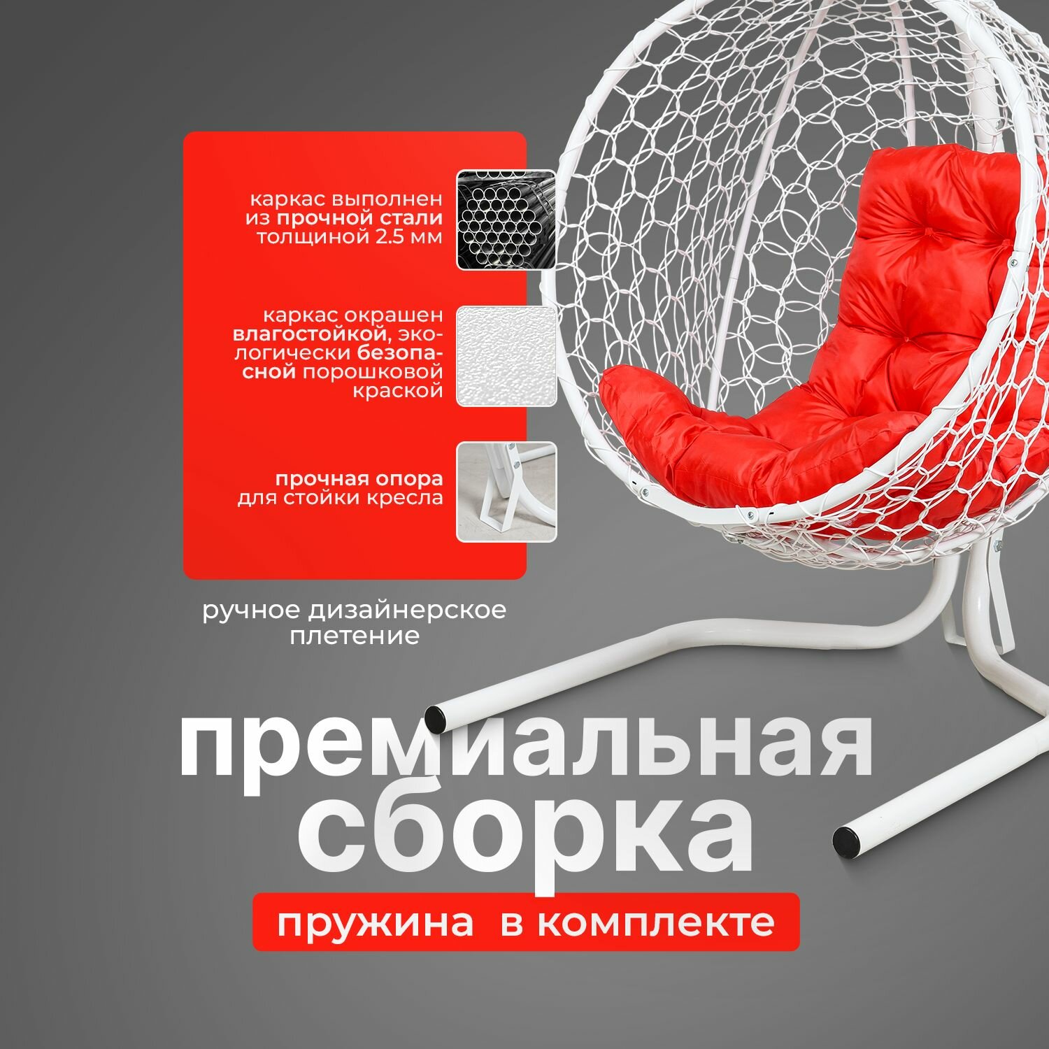 Купить Подвесное кресло кокон садовое 175х105х63см. Усиленная стойка до 200 кг Белый, подушка трапеция Красная.