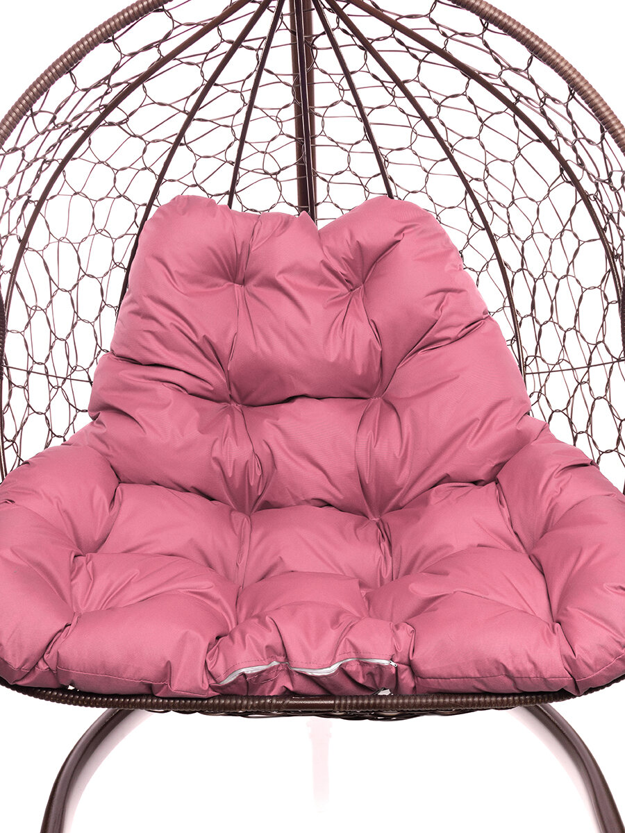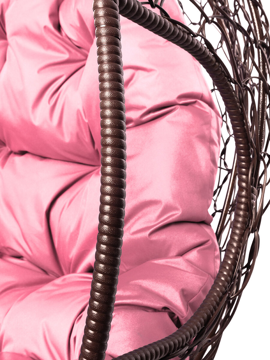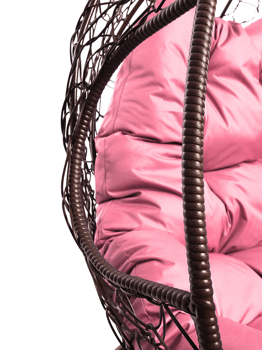 Подвесное кресло для двоих с ротангом коричневое, розовая подушка