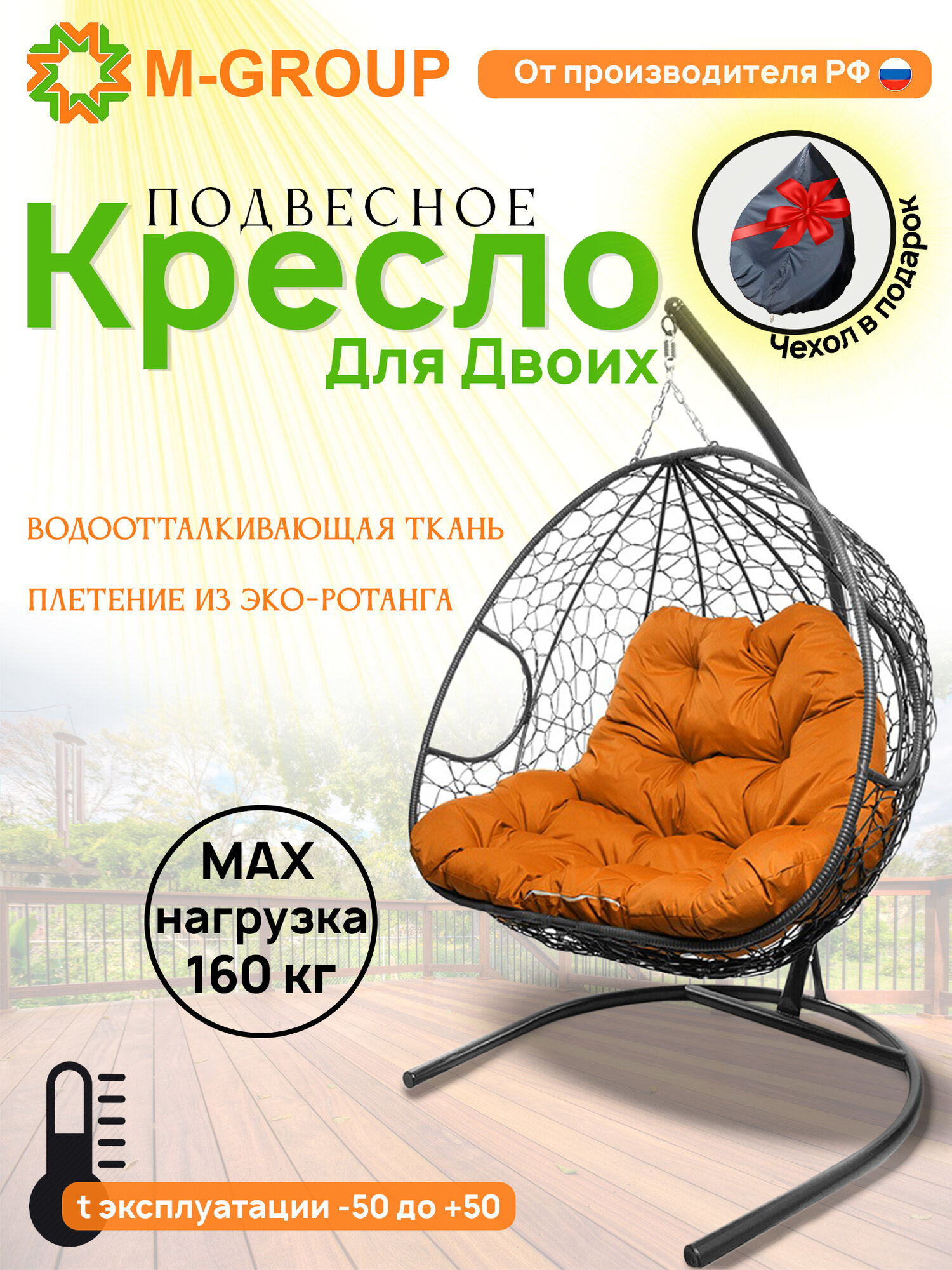 Подвесное кресло M-group для двоих люкс с ротангом белое оранжевая подушка