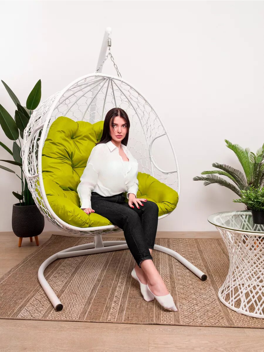 Подвесное кресло для двоих с ротангом белое, зелёная подушка