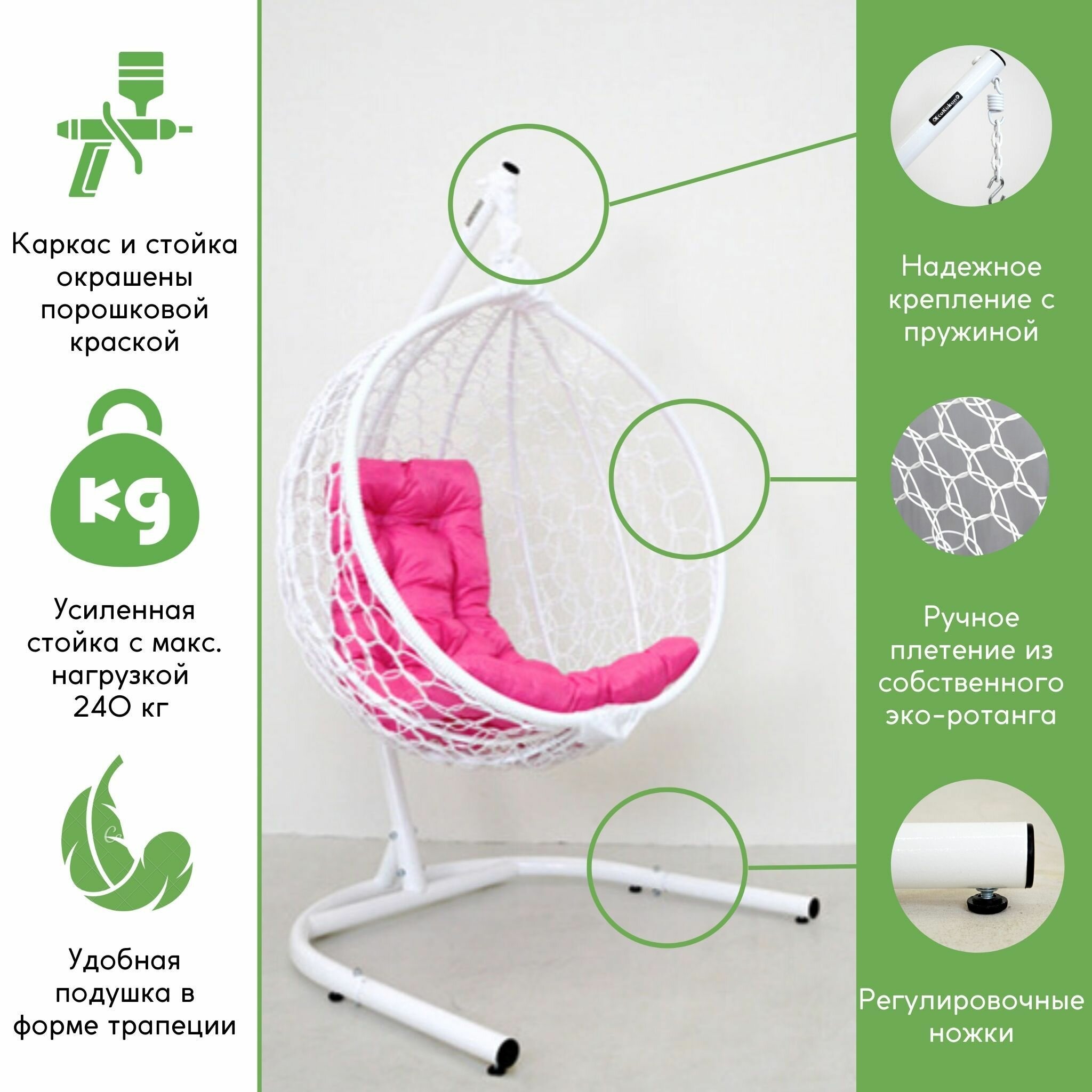 Подвесное кресло садовое кресло кокон для отдыха дома Mollis Ажур 240 кг EcoKokon одноместное с усиленной стойкой Белый с зеленой подушкой трапеция