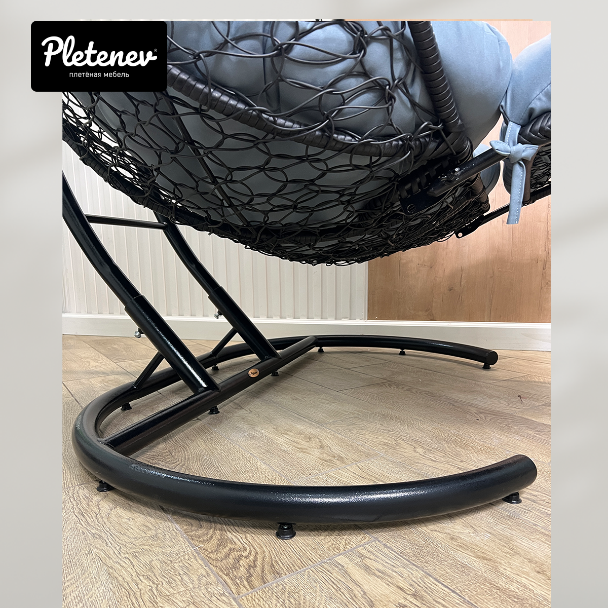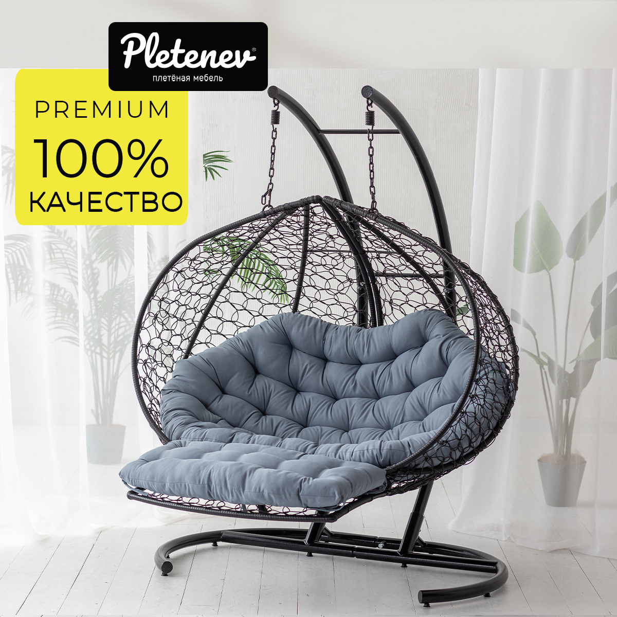 Купить Подвесное кресло-реклайнер "Pletenev" двухместное черное со светло-серой подушкой