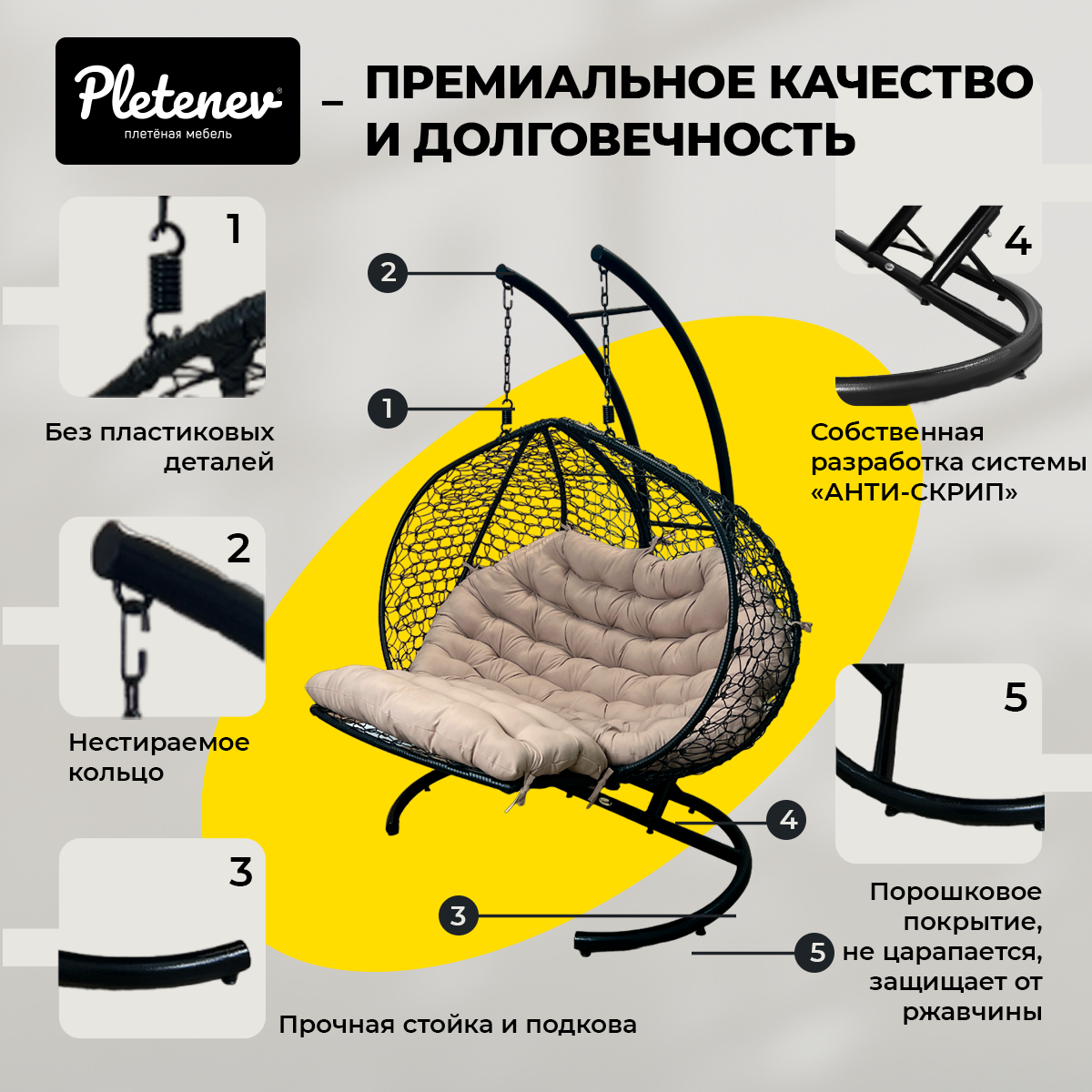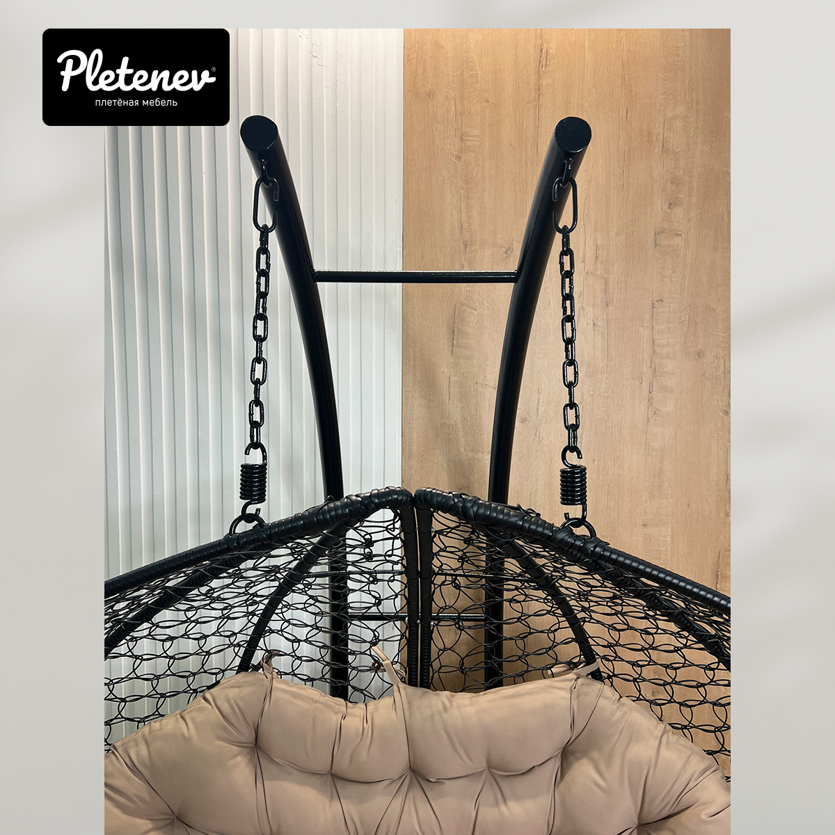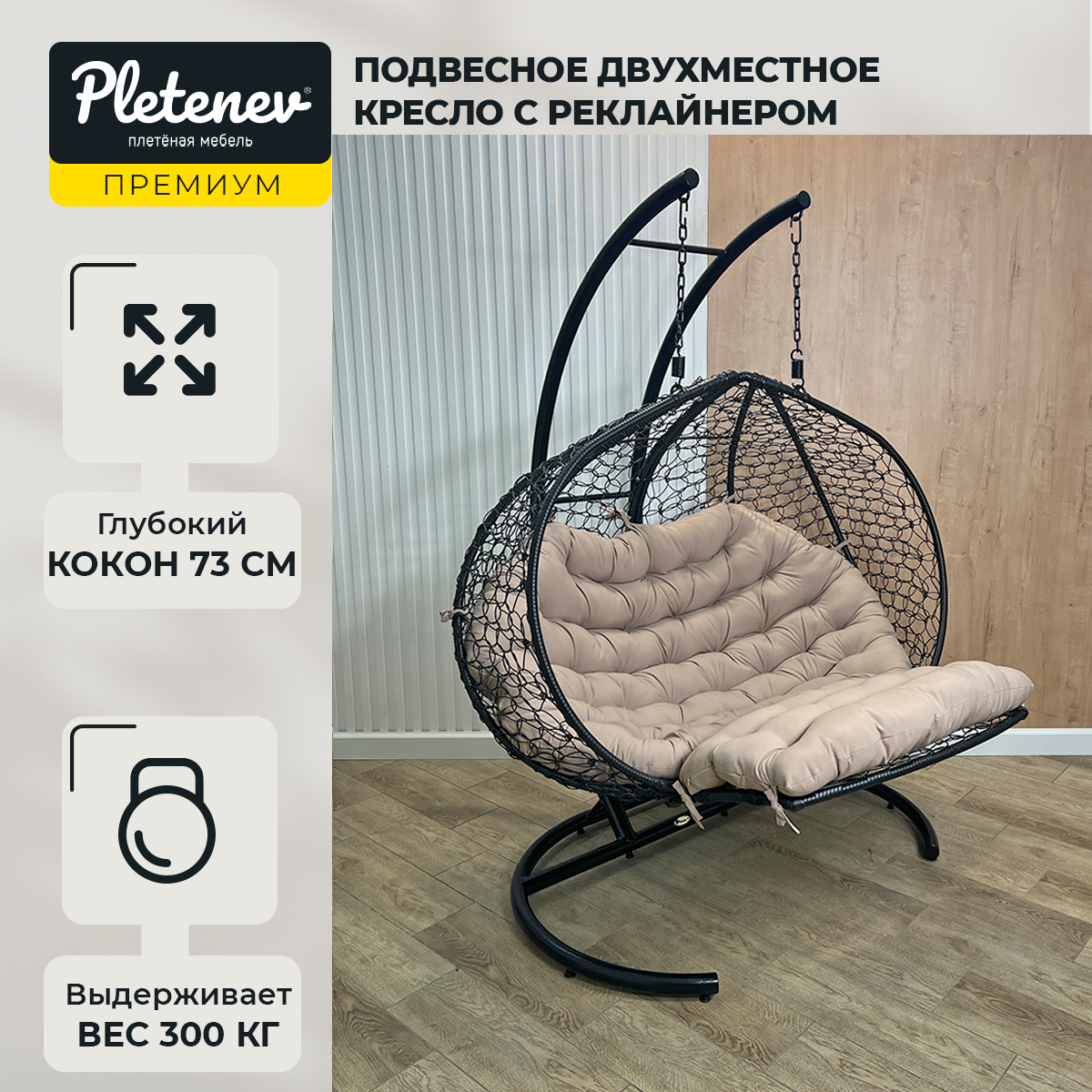 Купить Подвесное кресло Pletenev Двухместное Реклайнер Черное с Темно-бежевой подушкой
