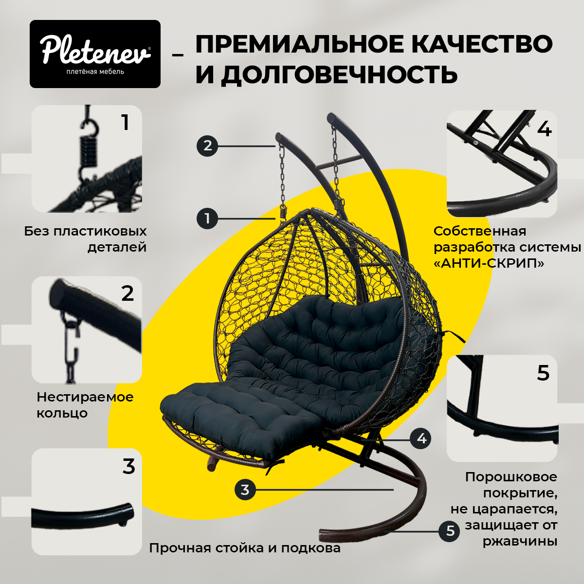 Подвесное кресло Pletenev Двухместное с водоотталкивающей уличной подушкой