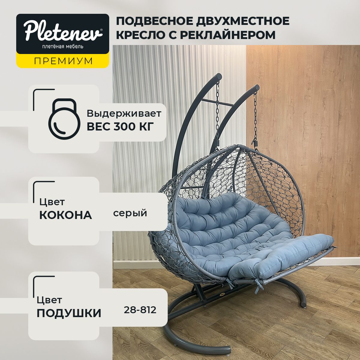 Купить Подвесное кресло Pletenev Двухместное Реклайнер Серый + светло-серая подушка