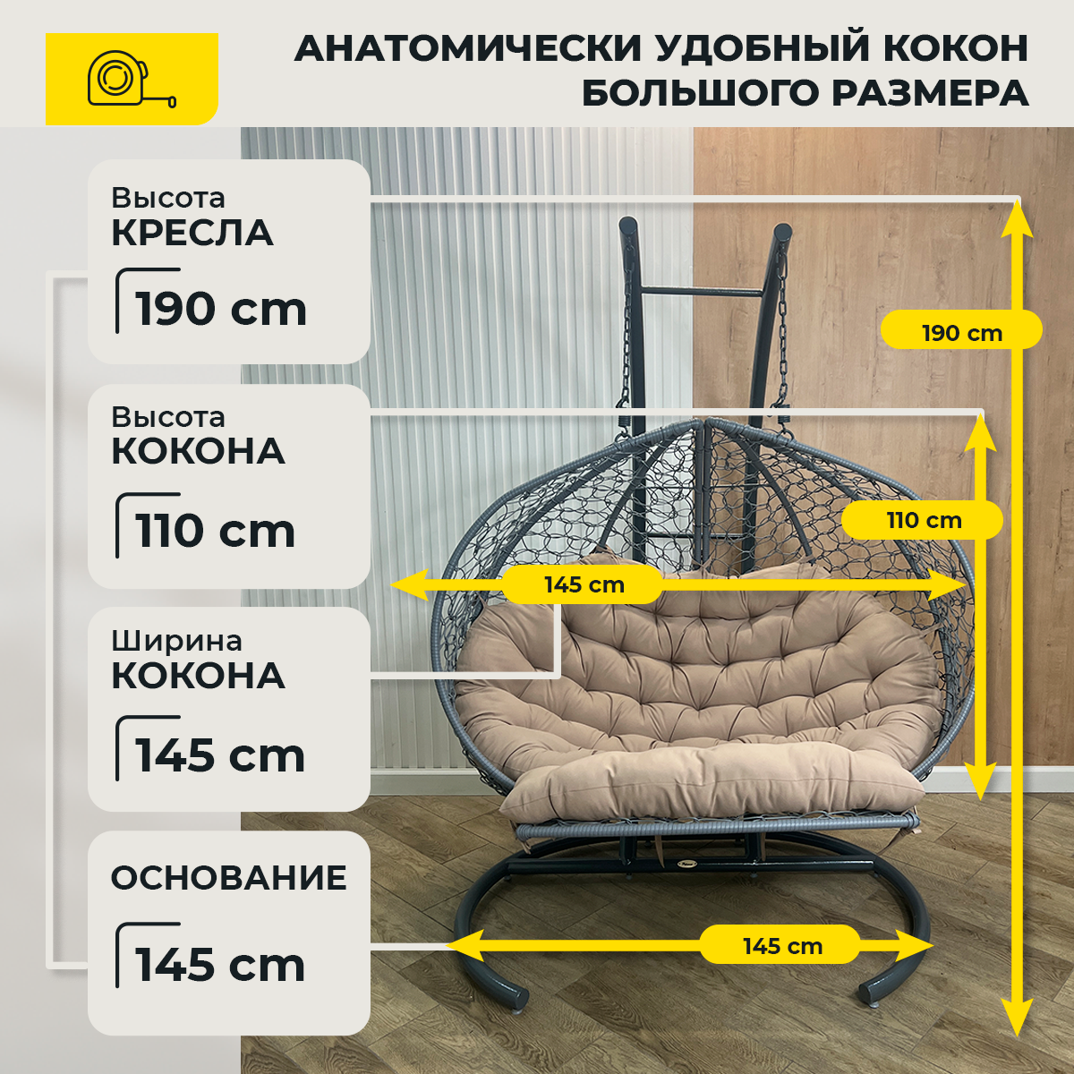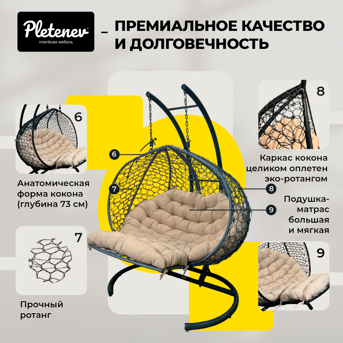 Подвесное кресло Pletenev Двухместное с водоотталкивающей уличной подушкой