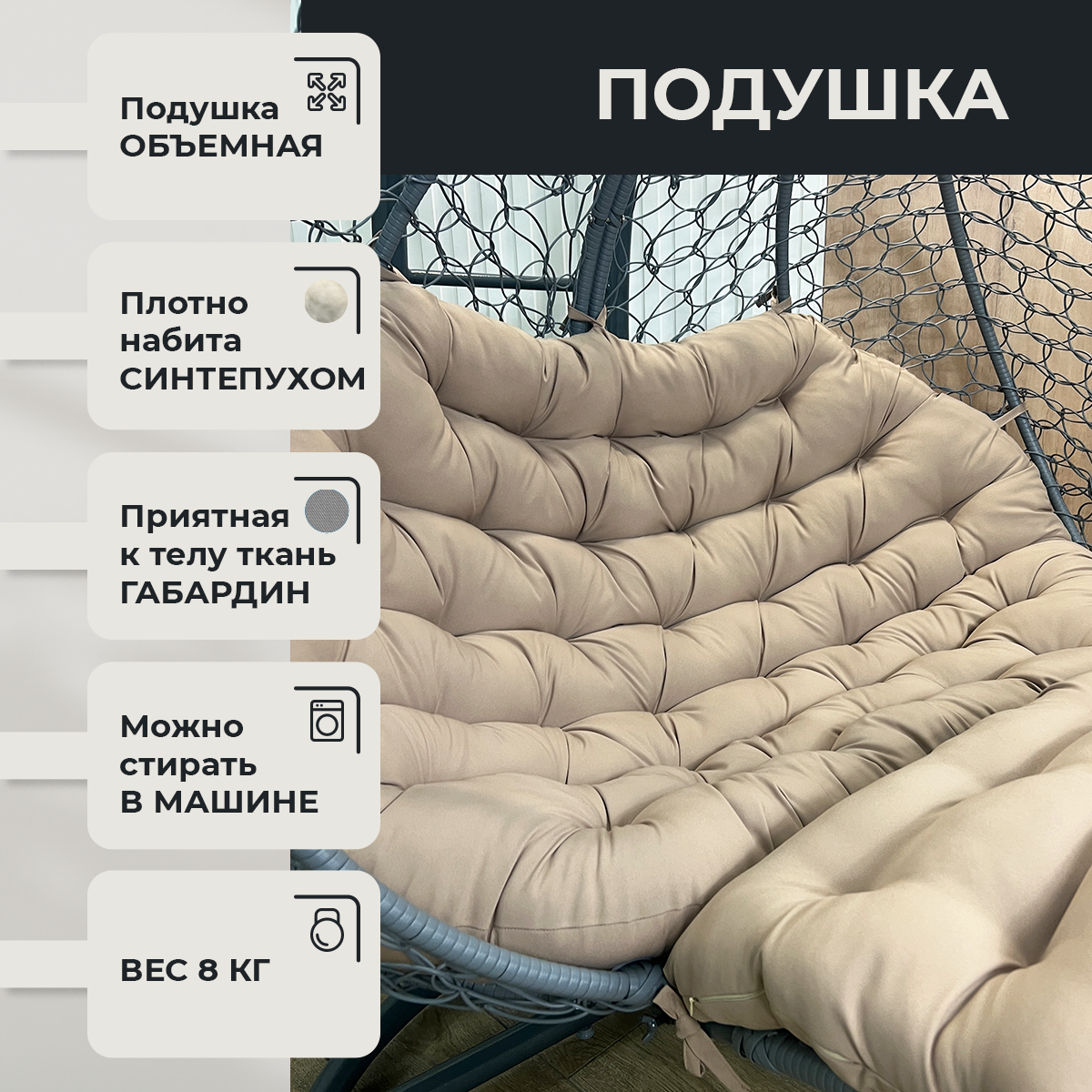 Подвесное кресло Pletenev Двухместное белое кресло с Темно-бежевой подушкой