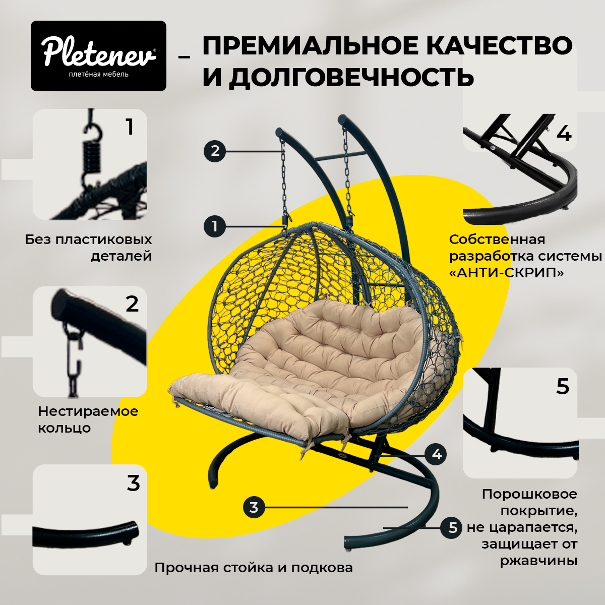 Ниже Вы можете прочитать отзывы на Подвесное кресло Pletenev Двухместное серое с бежевой подушкой с реклайнером, ознакомится с подробными характеристиками, посмотреть интересные обзоры и фотографии на Подвесное кресло Pletenev Двухместное серое с бежевой подушкой с реклайнером.