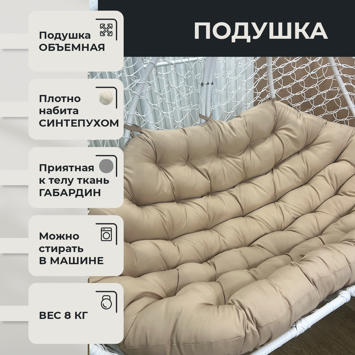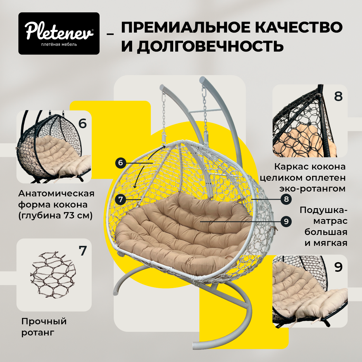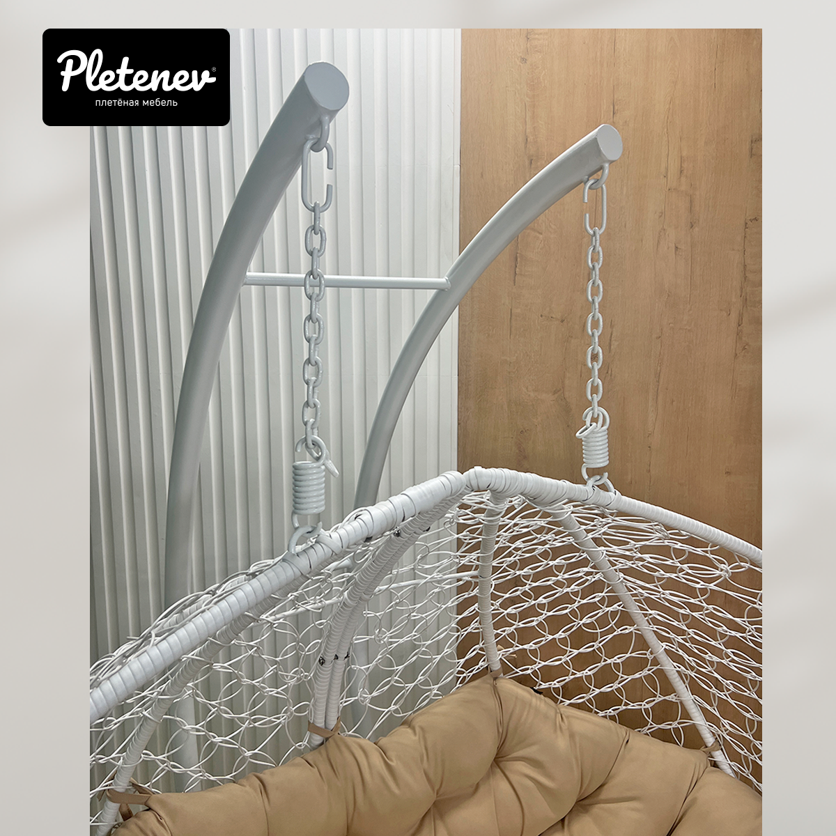 СохранитьПодвесное кресло "Pletenev" Двухместное белое кресло с бежевой подушкой интересное: