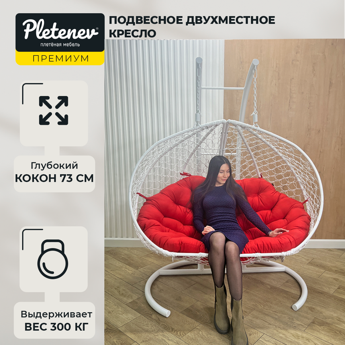 Купить Подвесное кресло Pletenev Двухместное белое кресло с Красной подушкой