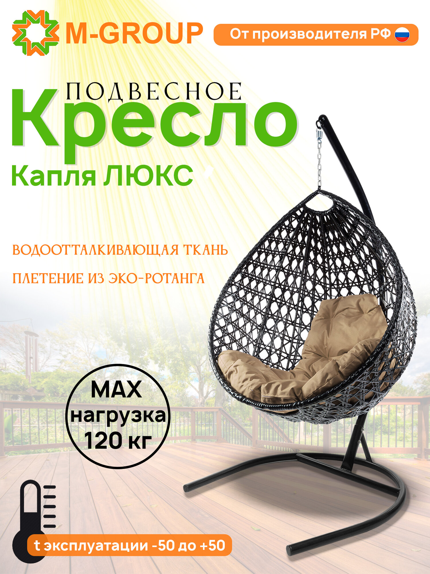 Подвесное кресло M-group капля люкс с ротангом чёрное коричневая подушка