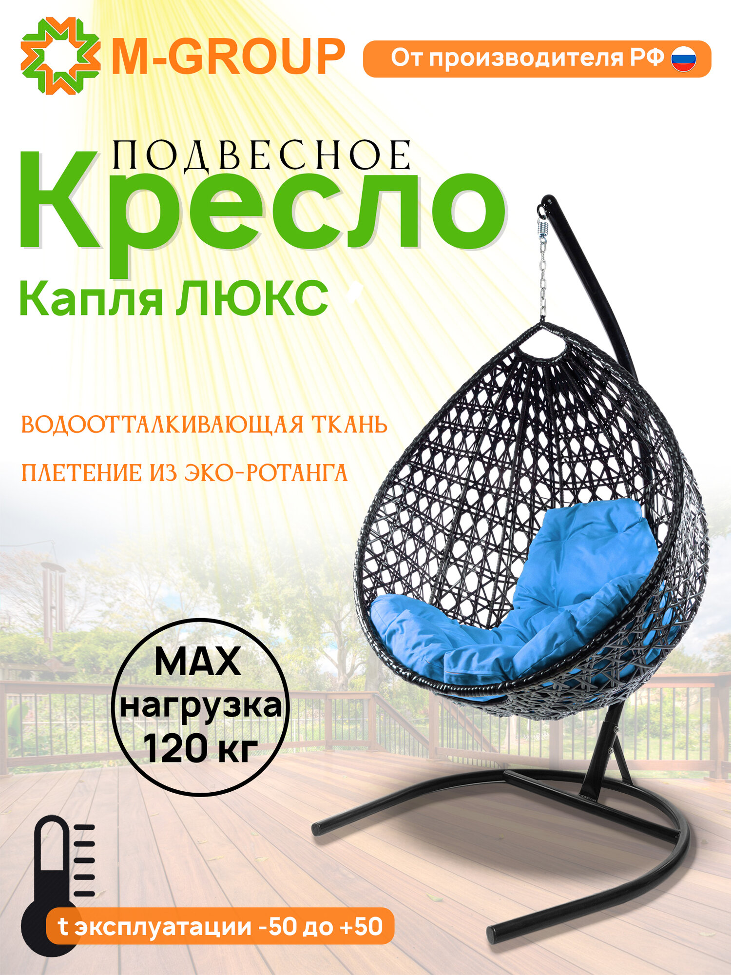 Подвесное кресло M-group капля люкс с ротангом чёрное синяя подушка