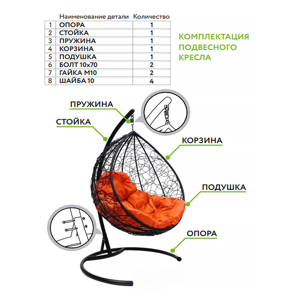 | Комплектация | Кокон-кресло-1шт, подушка-1шт, стойка-1шт, основание-1шт, болт М10х70-2шт, гайка М10-2шт, шайба 10-2шт, пружина-1шт. |