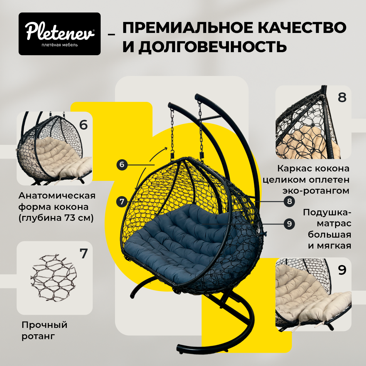 Подвесное кресло Pletenev Двухместное чёрное с Бежевой подушкой