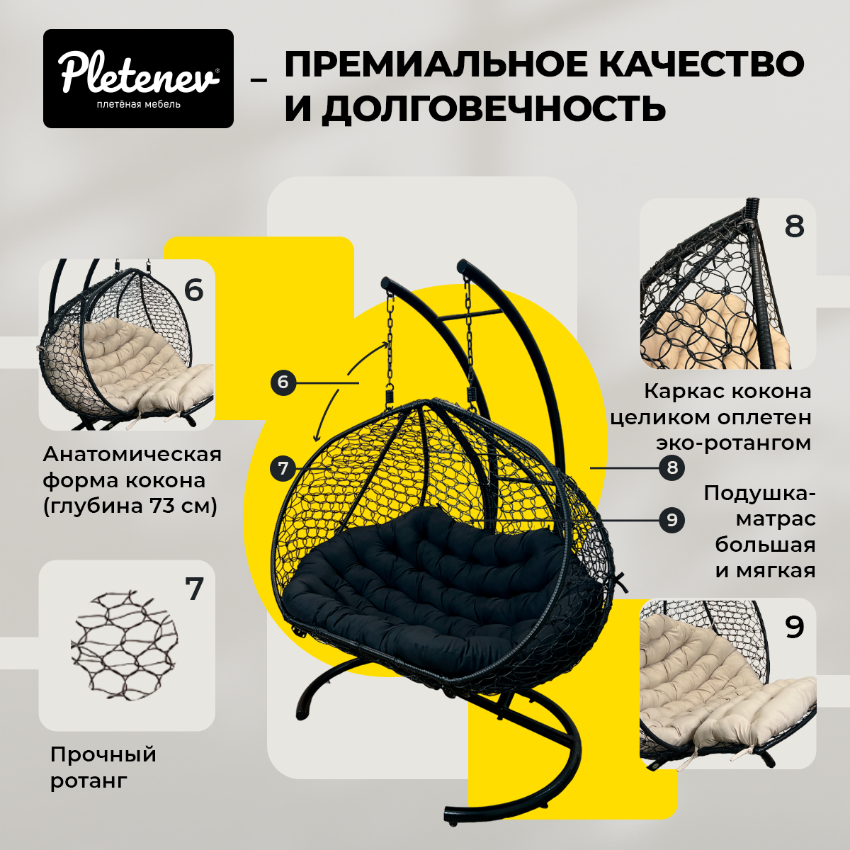 Подвесное кресло Pletenev Двухместное чёрное с Бежевой подушкой