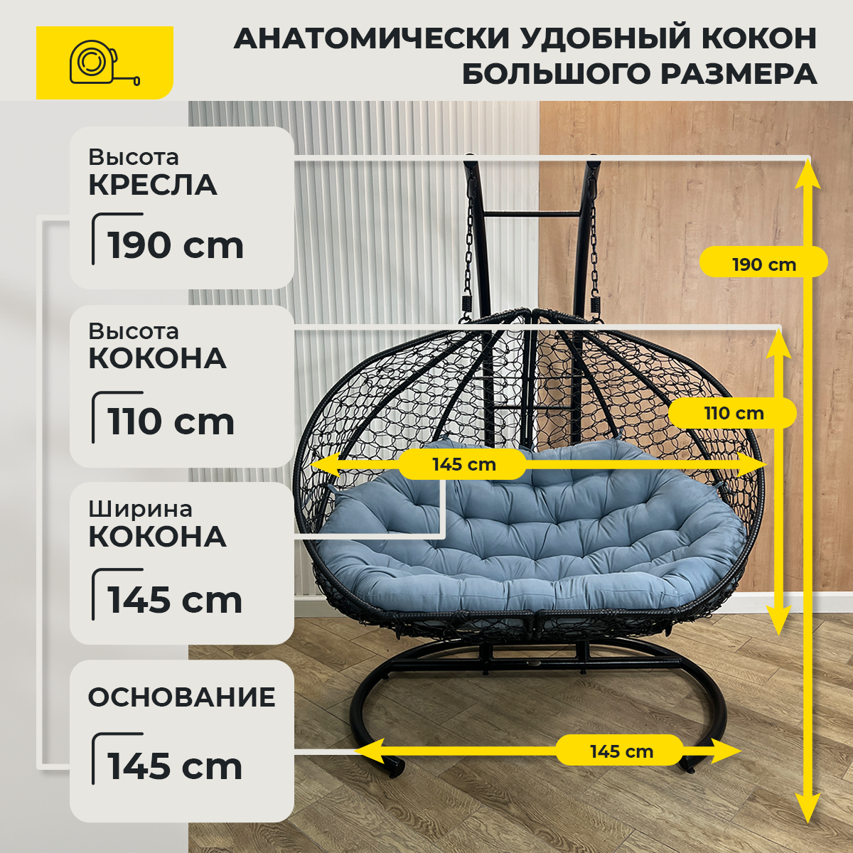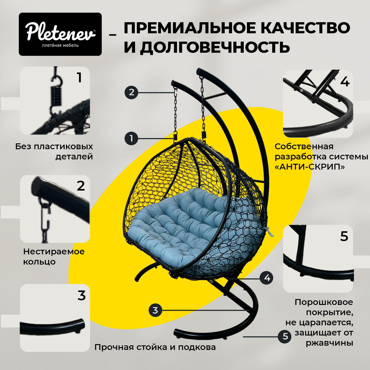 СохранитьПодвесное кресло Pletenev Двухместное чёрное со Светло-Серой подушкой интересное: