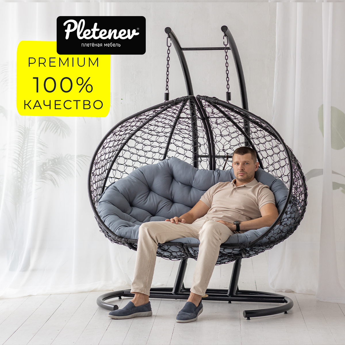 Купить Подвесное кресло Pletenev Двухместное чёрное со Светло-Серой подушкой