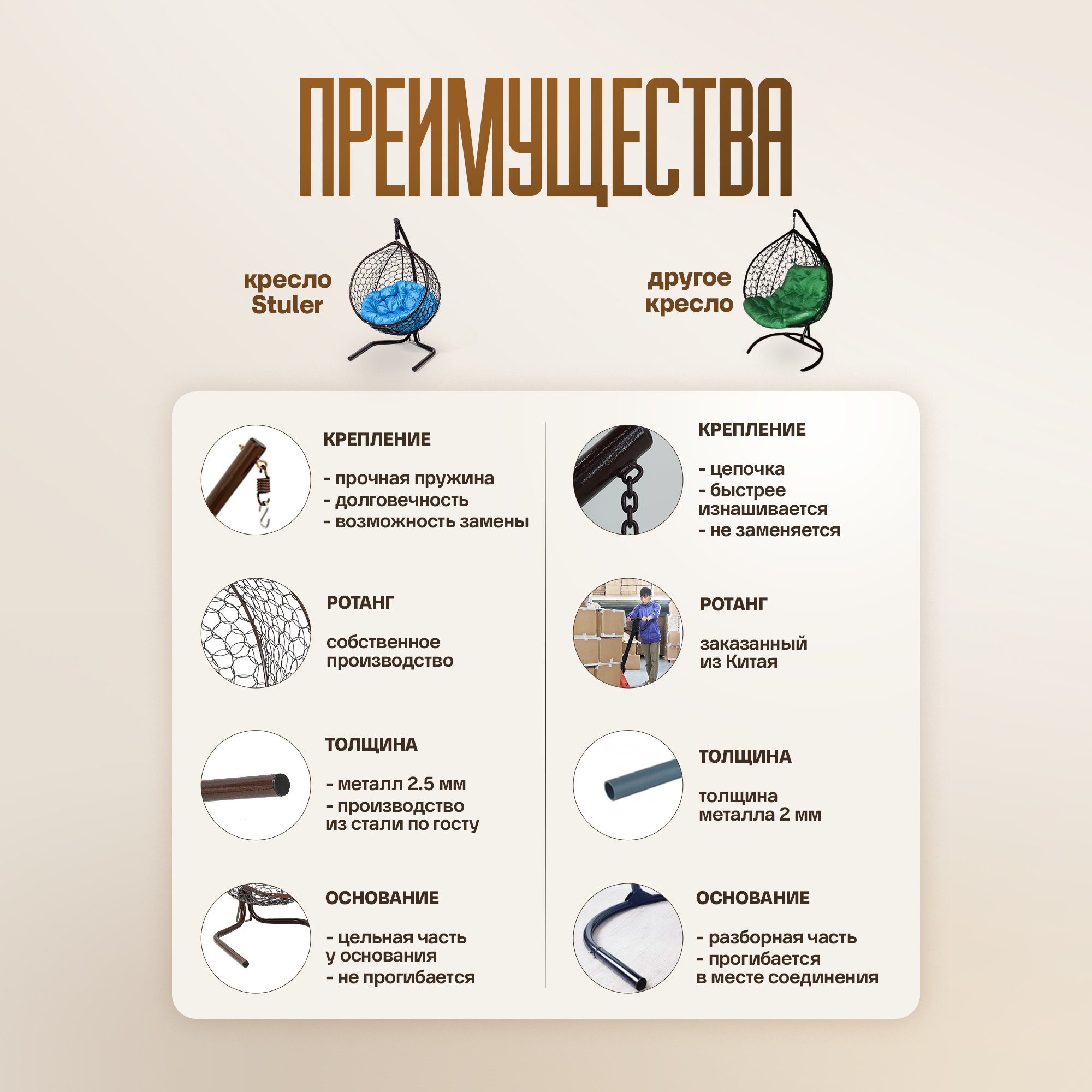 | Комплектация | 1) Сборно-разборная усиленная металлическая стойка. Основание разборное в форме бабочки обеспечивает устойчивое положение. Конструкция выдерживает максимальную нагрузку до 200 кг. Высота стойки - 160 см. 2) Складной кокон с плетением Ажур. Кокон оплетается вручную собственным ротангом. Размеры кокона: Высота-115 +-3 см, Ширина -105 +-3см, Глубина - 63 +-3 см 3) Подушка круглая, плотно набитая Холлофайбером, который служит 3-4 дольше и сохранит свою форму. Материал чехла подушки - Оксфорд, влагоотталкивающая ткань. 4) Комплект креплений. |