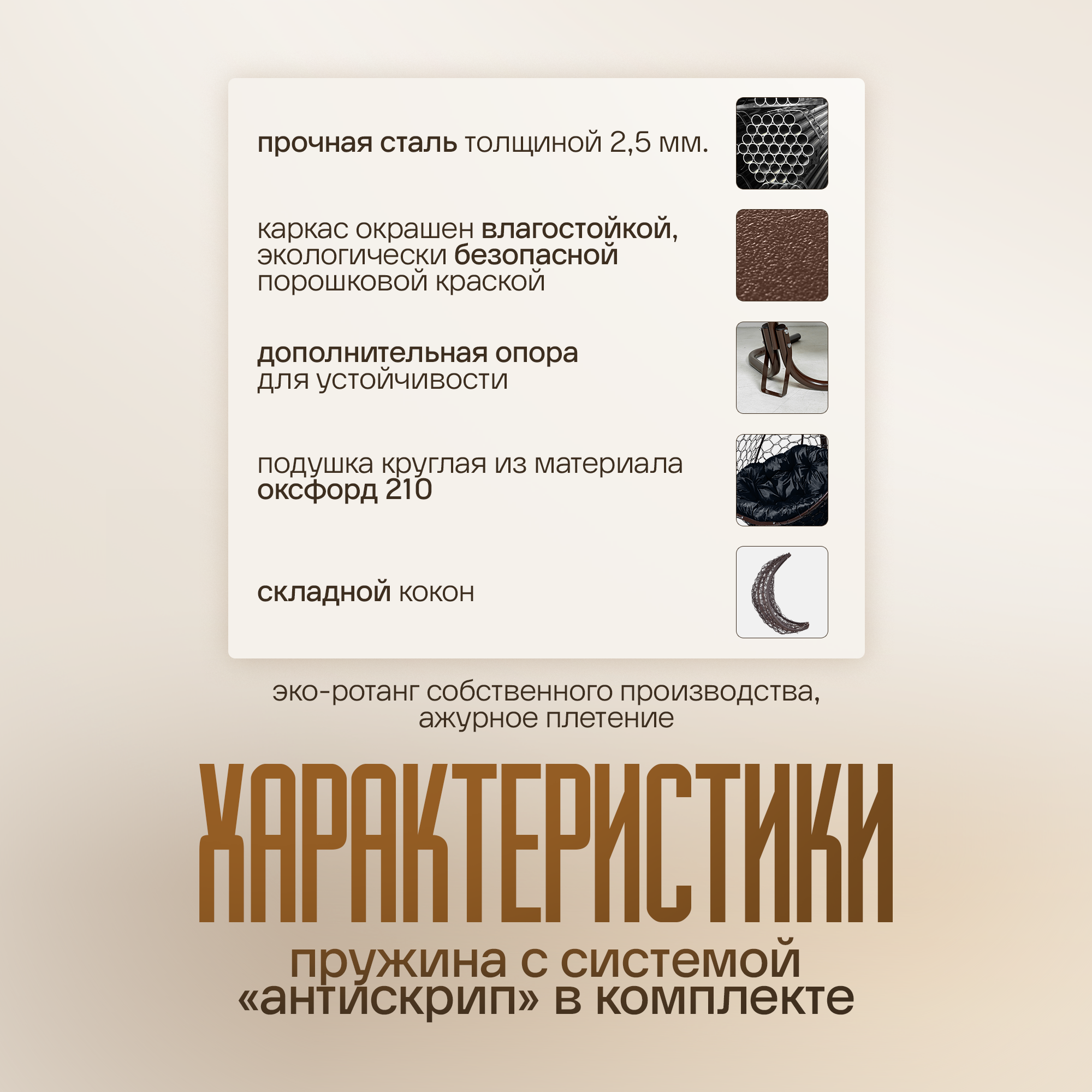| Комплектация | 1) Сборно-разборная усиленная металлическая стойка. Основание разборное в форме бабочки обеспечивает устойчивое положение. Конструкция выдерживает максимальную нагрузку до 200 кг. Высота стойки - 160 см. 2) Складной кокон с плетением Ажур. Кокон оплетается вручную собственным ротангом. Размеры кокона: Высота-115 +-3 см, Ширина -105 +-3см, Глубина - 63 +-3 см 3) Подушка круглая, плотно набитая Холлофайбером, который служит 3-4 дольше и сохранит свою форму. Материал чехла подушки - Оксфорд, влагоотталкивающая ткань. 4) Комплект креплений. |