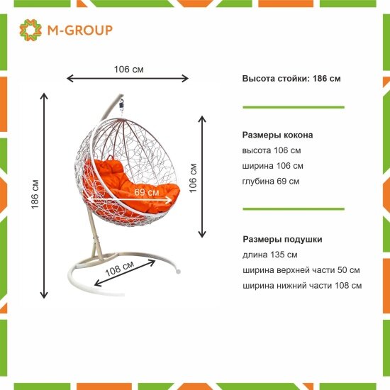 | Комплектация | Кокон-кресло-1шт, подушка-1шт, стойка-1шт, основание-1шт, болт М10х70-2шт, гайка М10-2шт, шайба 10-2шт, пружина-1шт. |