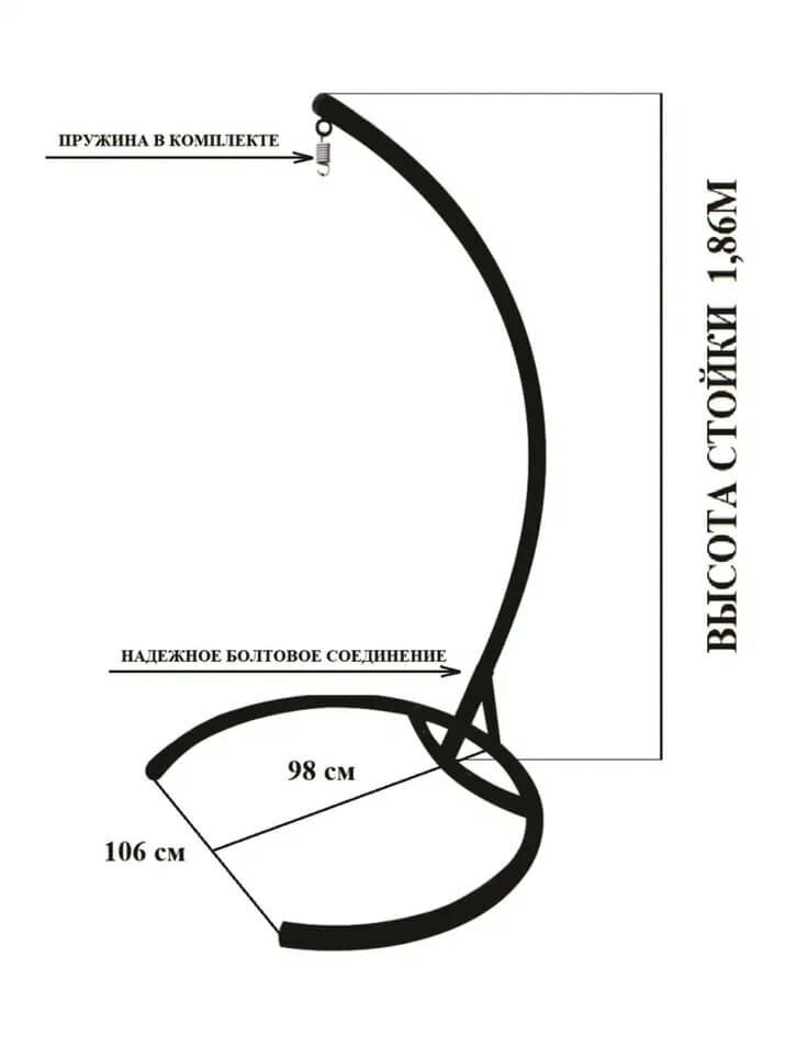 | Комплектация | Кокон-кресло-1шт, подушка-1шт, стойка-1шт, основание-1шт, болт М10х70-2шт, гайка М10-2шт, шайба 10-2шт, пружина-1шт. |