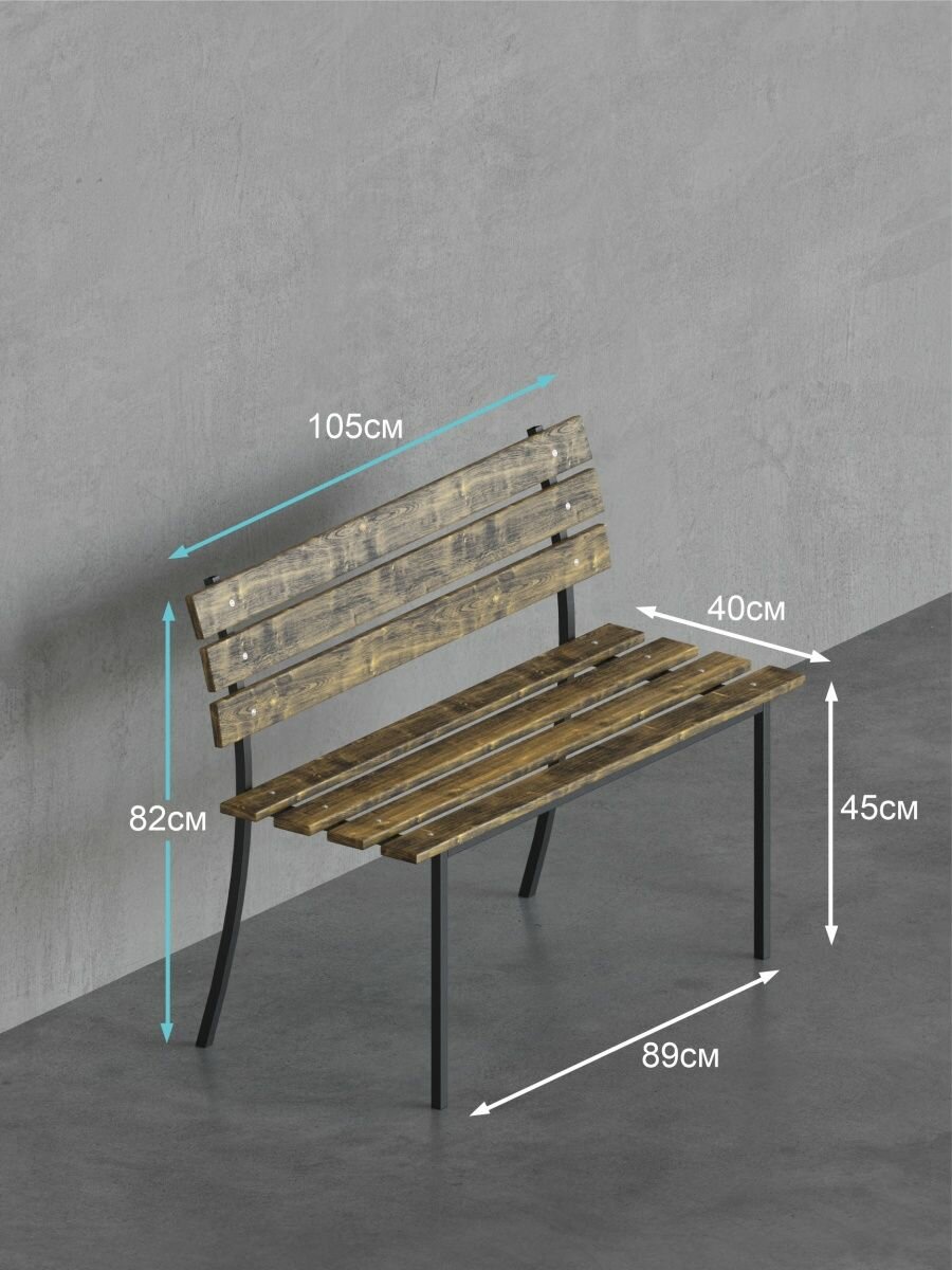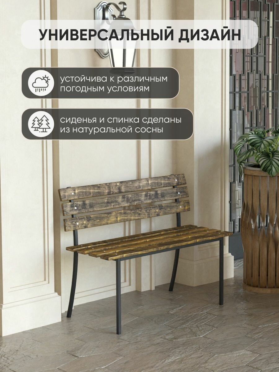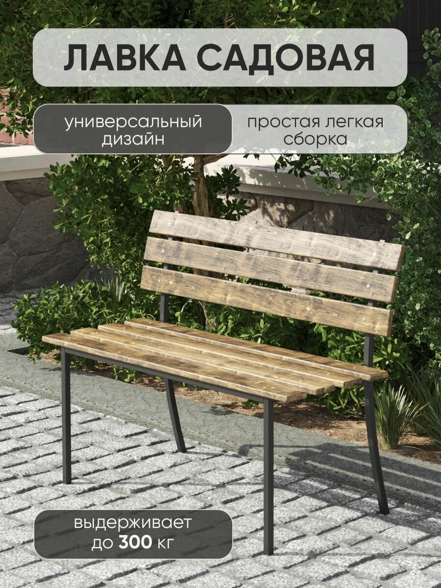 Скамейка садовая Классика с деревянными спинкой и сиденьем без покраски, лавочка для дачи с металлическим каркасом