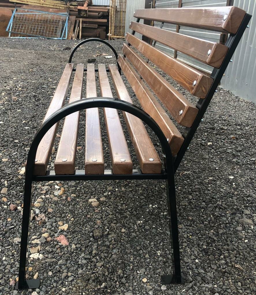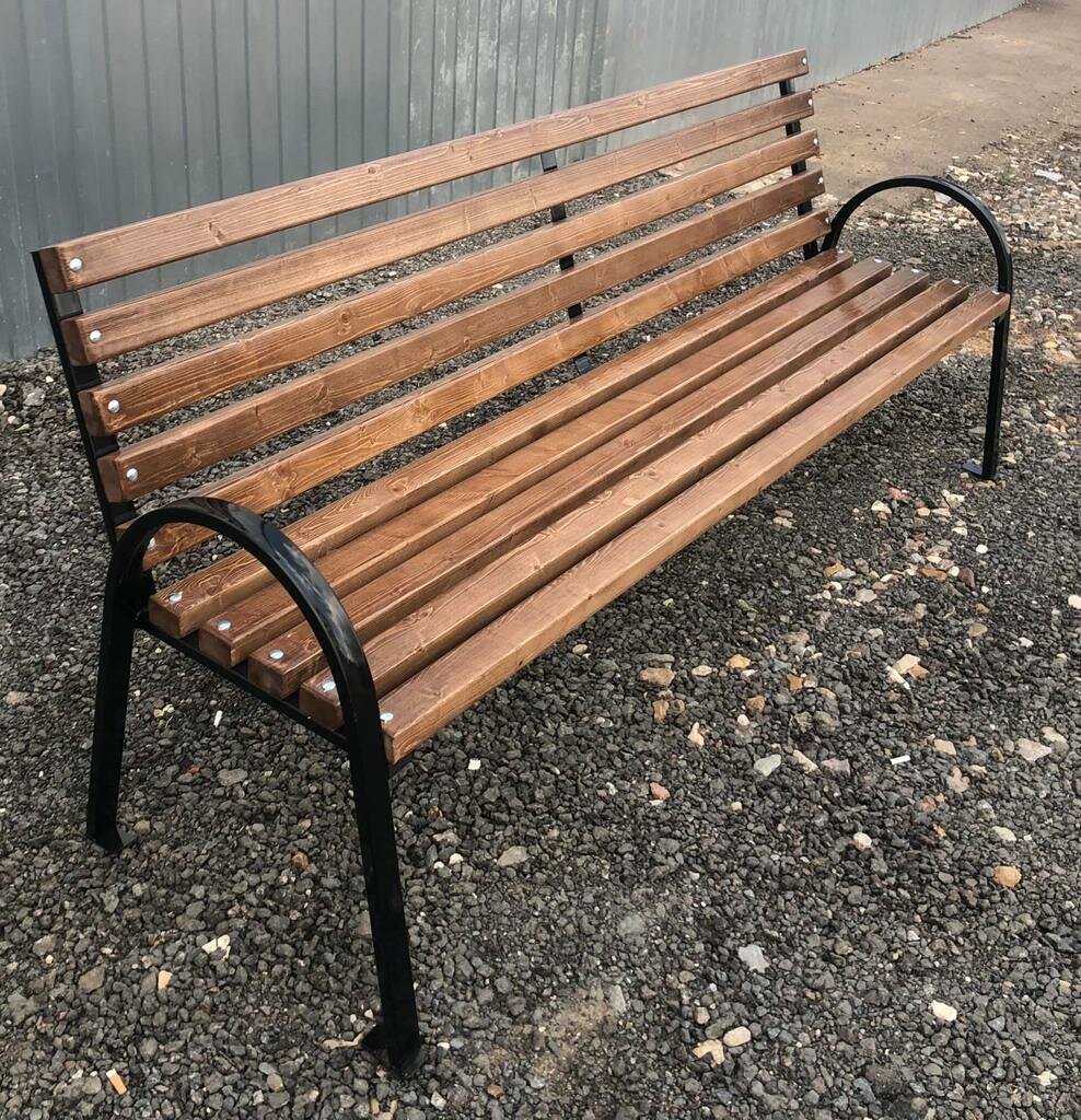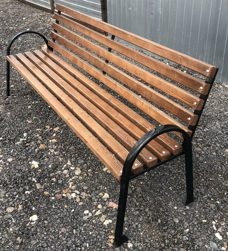 Скамейка садовая Классика с деревянными спинкой и сиденьем без покраски, лавочка для дачи с металлическим каркасом