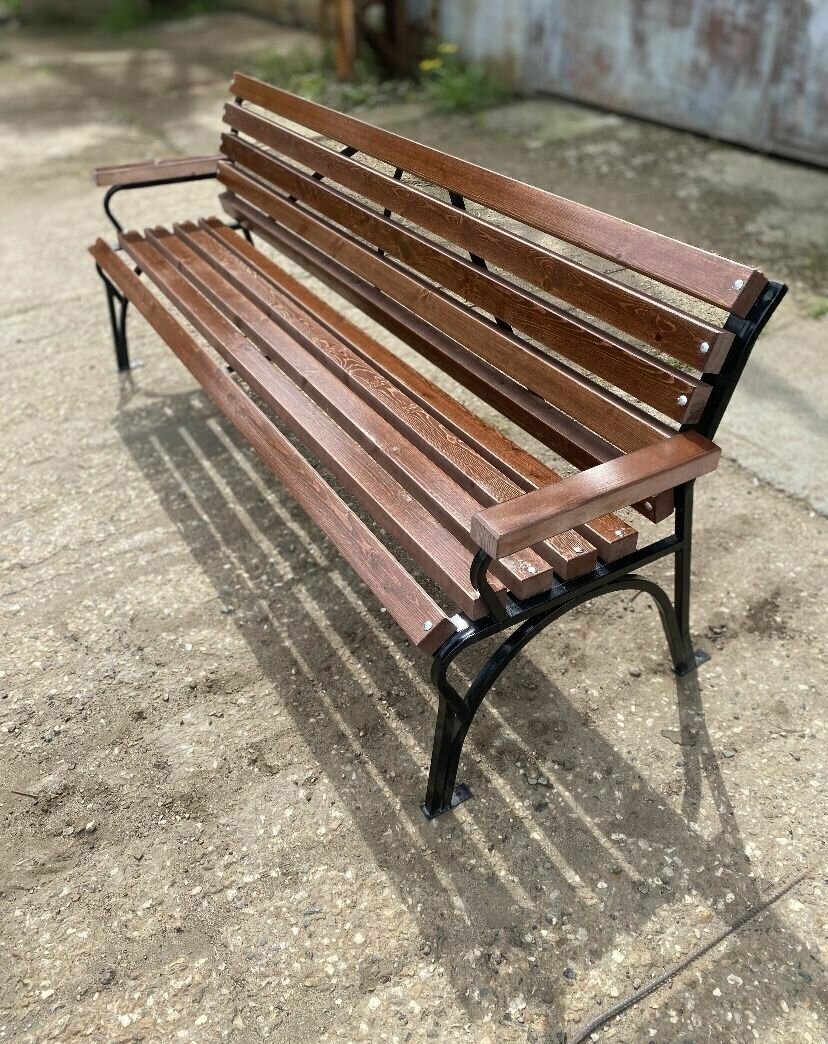 Скамейка садовая Классика с деревянными спинкой и сиденьем без покраски, лавочка для дачи с металлическим каркасом