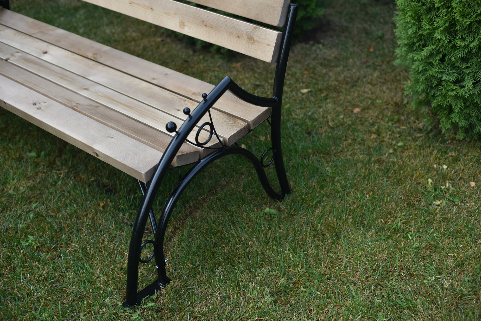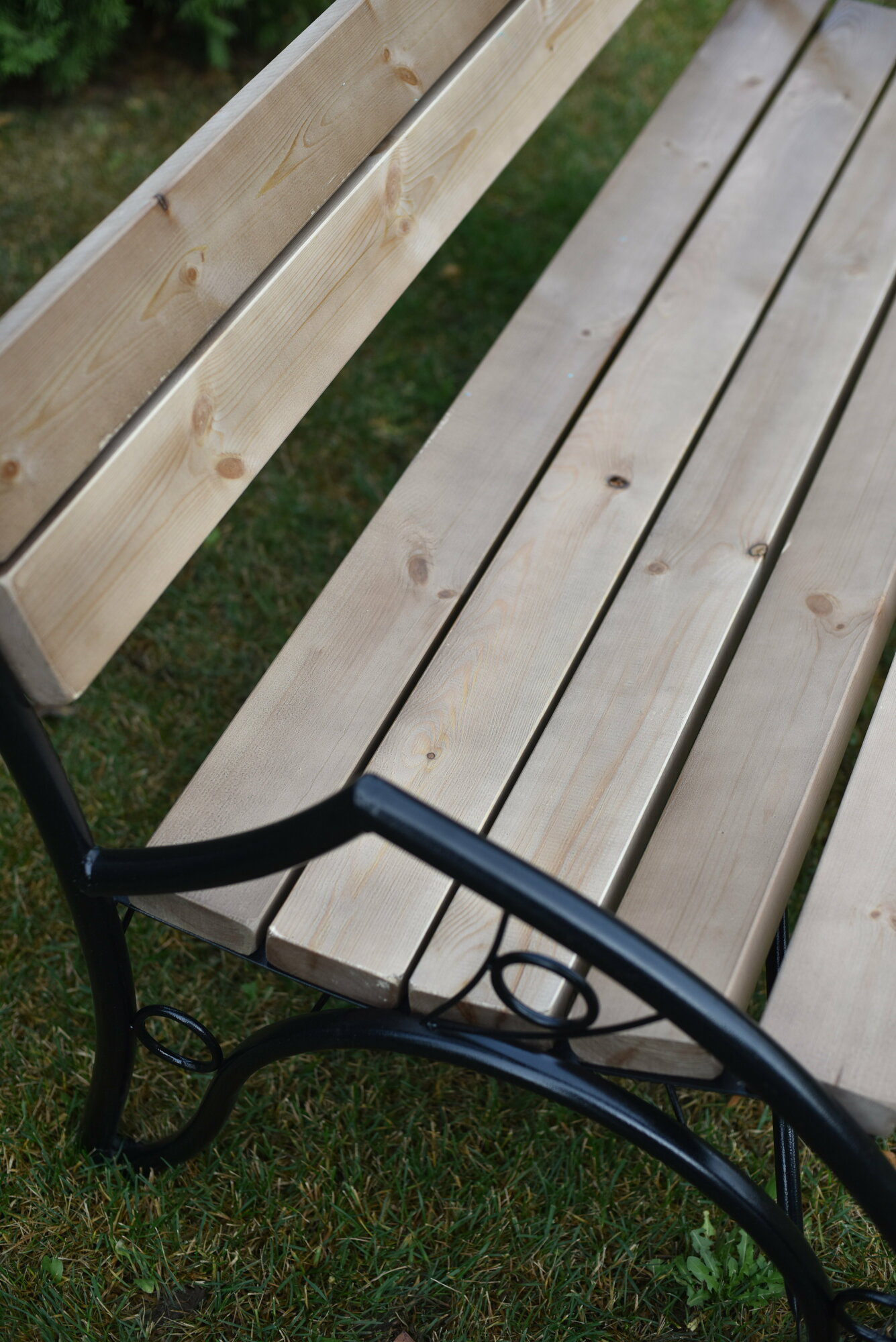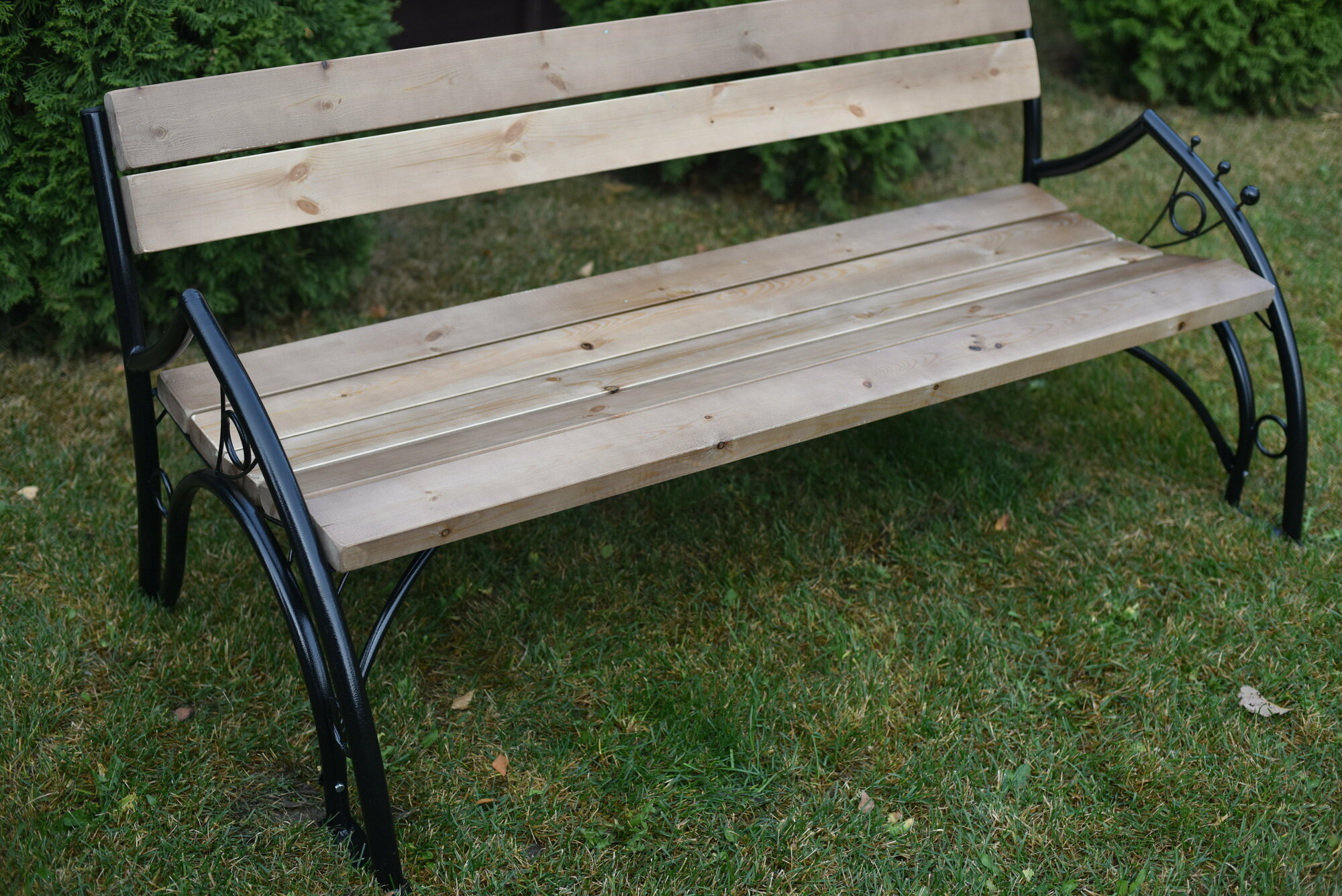 Скамейка садовая Классика с деревянными спинкой и сиденьем без покраски, лавочка для дачи с металлическим каркасом