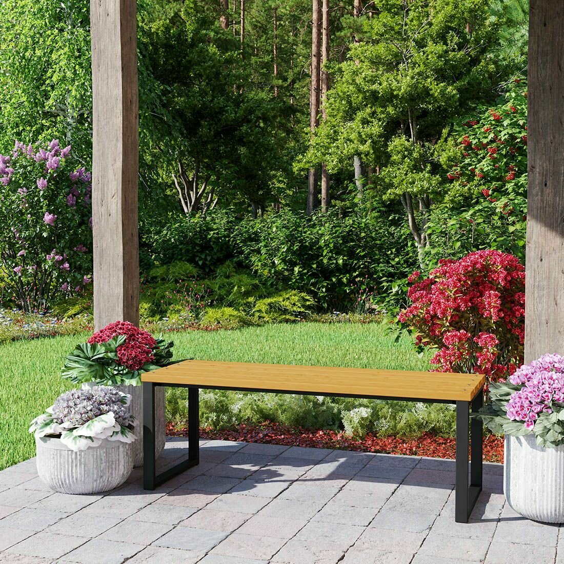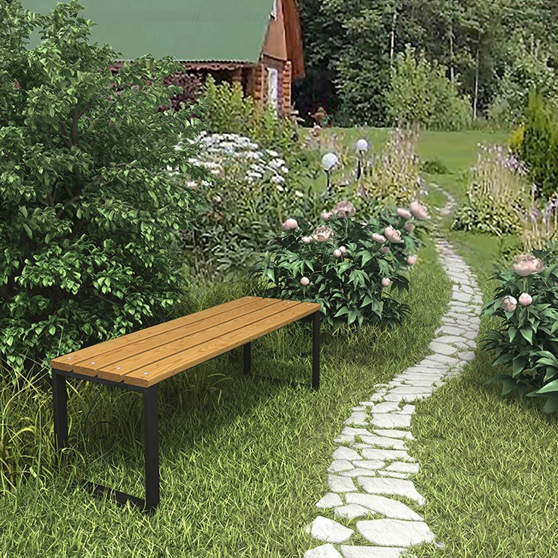 Скамейка садовая Классика с деревянными спинкой и сиденьем без покраски, лавочка для дачи с металлическим каркасом