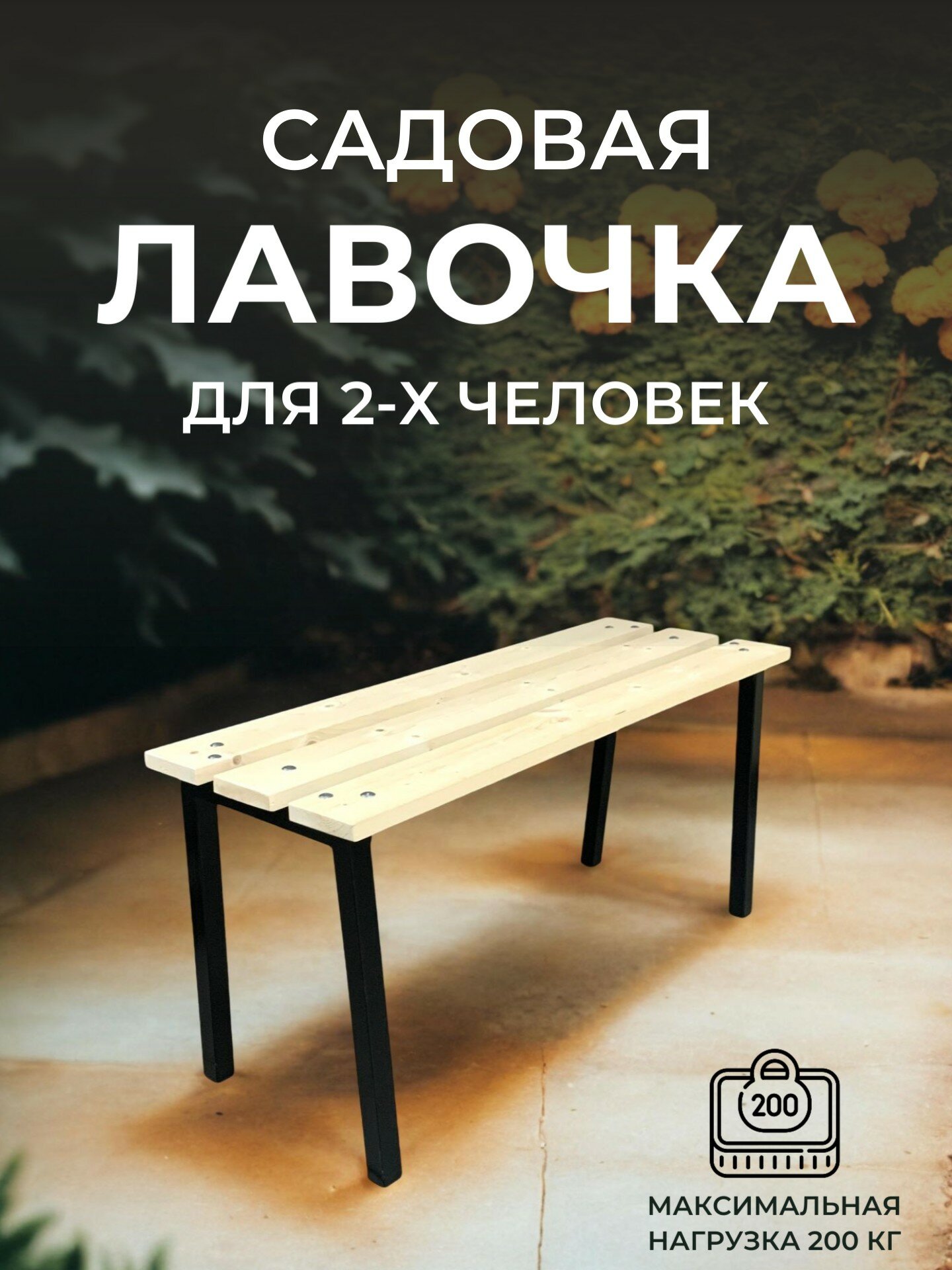 Скамейка садовая Классика с деревянными спинкой и сиденьем без покраски, лавочка для дачи с металлическим каркасом