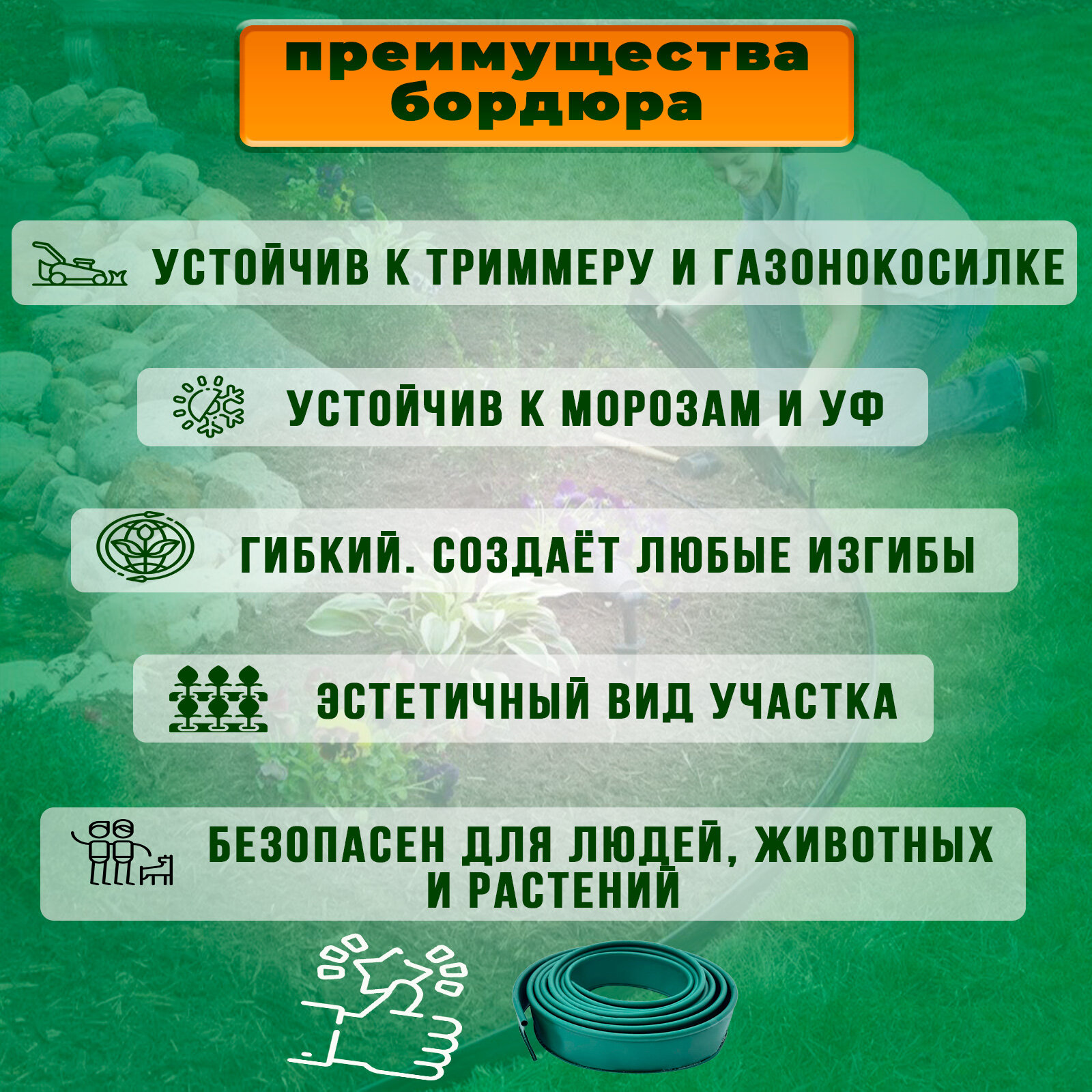 | Дополнительная информация | Благодаря свойствам используемого материала, бордюр не разрушается под воздействием солнечных лучей. V-образная нижняя кромка дополнительно фиксирует бордюр в грунте, в виде якоря. Гибкость делает возможным применение бордюра при обрамлении сложных геометрических форм, в том числе малых радиусов. |