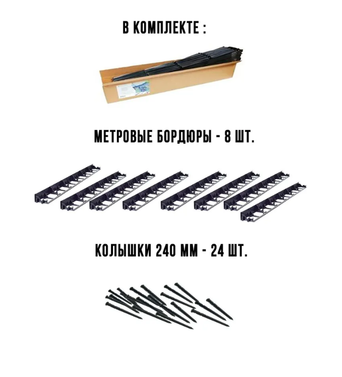 | Подробная комплектация | Бордюр 1м - 8 шт., колышек крепёжный 24см - 24 шт. |