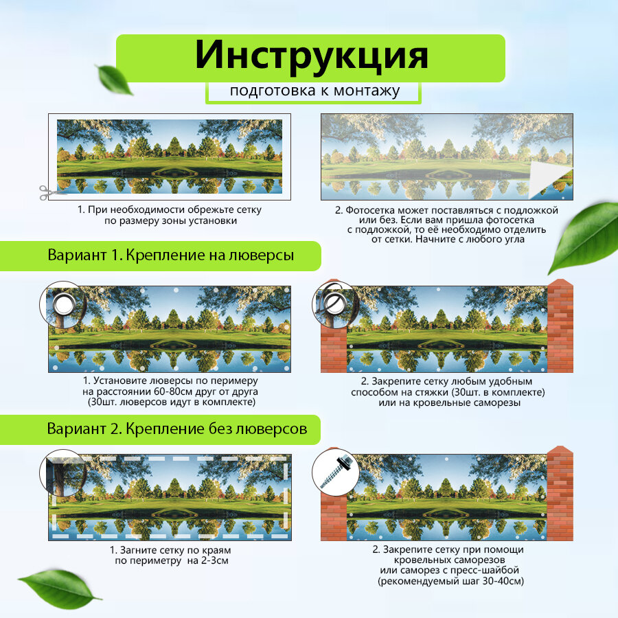 | Подробная комплектация | Фотофасад для забора для дачи Ашока 300х158 см, люверсы 15 шт, хомуты стяжки 15 шт, инструкция |