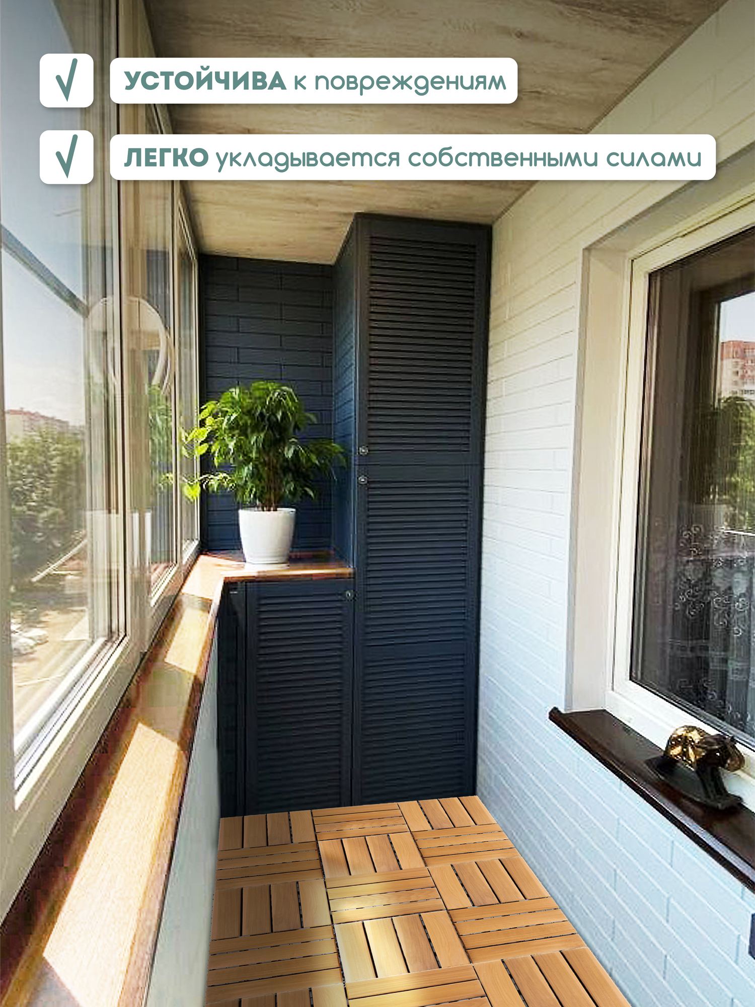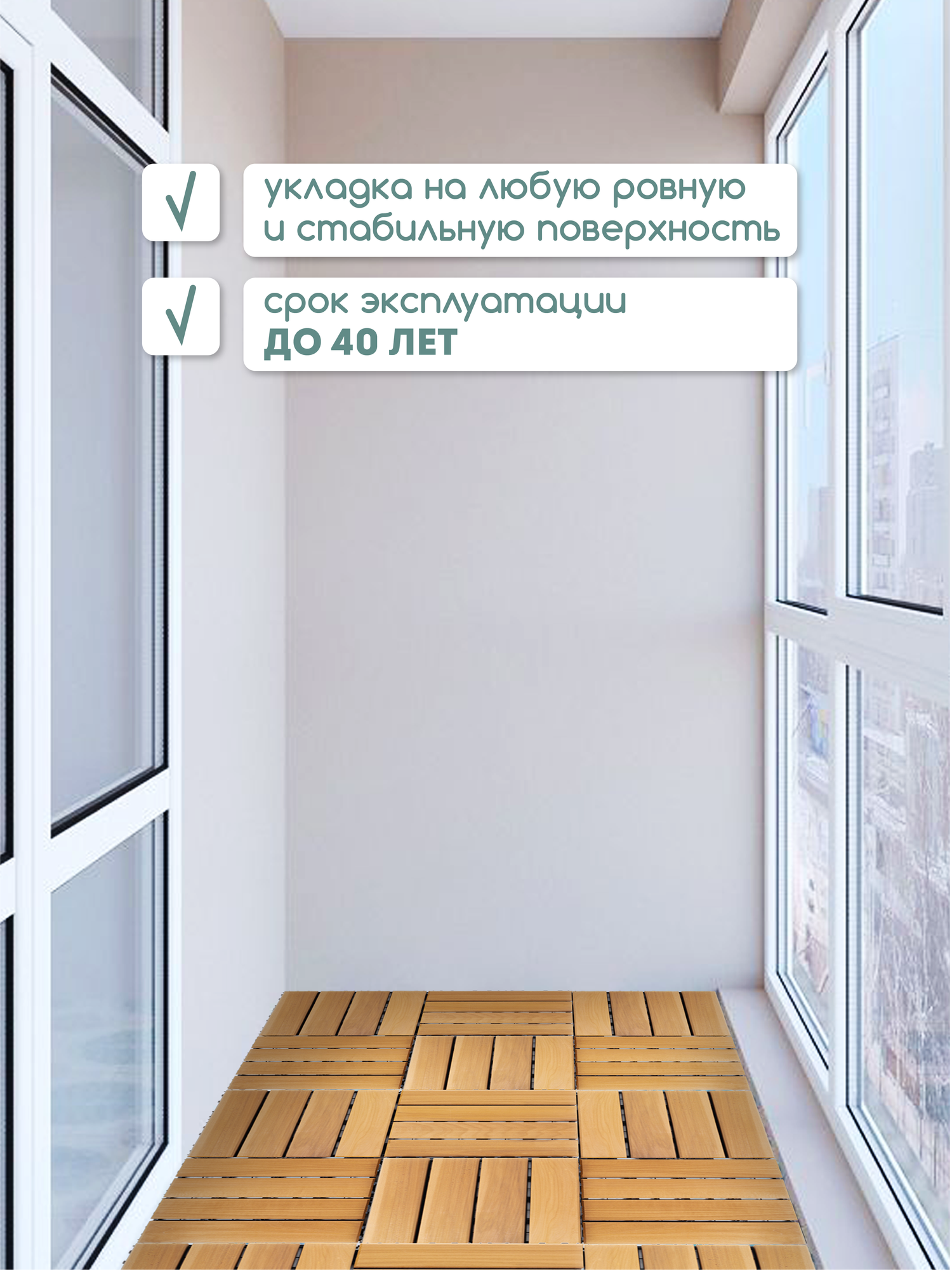 | Подробная комплектация | плитка модульная деревянная с пластиковой подложкой и креплениями для монтажа |