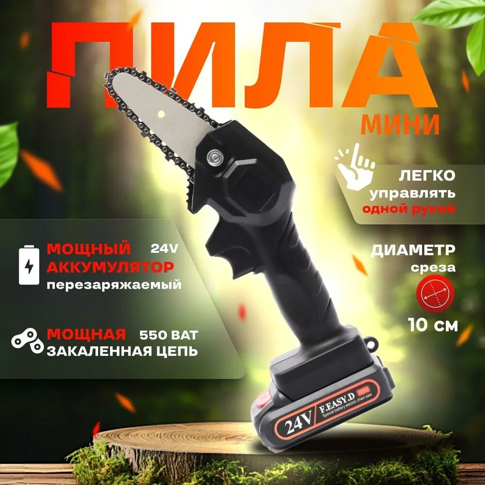 | Дополнительная информация | Цепная электропила мини, аккумуляторная ручная садовая 24V - идеальный выбор для домашнего использования. Она обладает компактными размерами и легким весом, что делает ее удобной в работе. Пила оснащена мощным аккумулятором на 24В, что обеспечивает длительное время работы без необходимости подзарядки. |