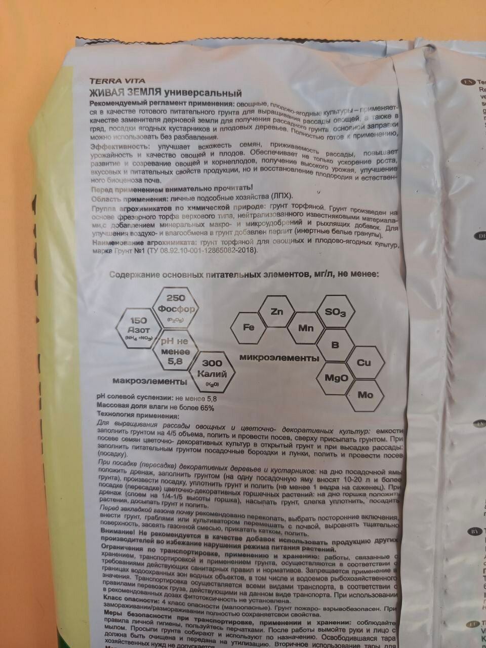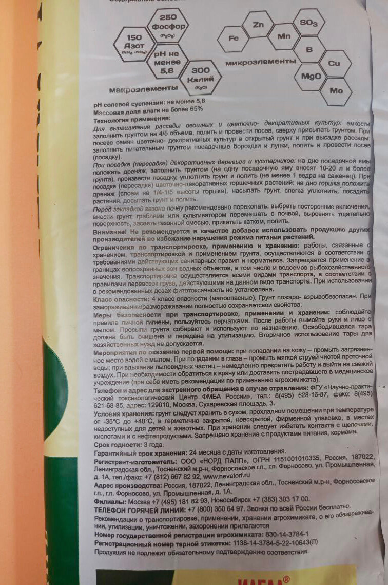| Основные питательные вещества в мг/л, не менее | Азот (NH4+NO3) 150 Фосфор (P2O5) 270 Калий (K2O) 300 pH солевой суспензии 6,0-6,5 |
