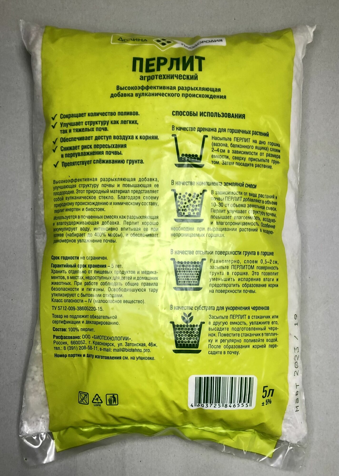 Перлит, Долина плодородия, агротехнический, для растений, влагоудерживающий, 5л