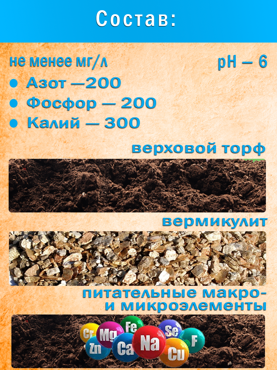 | Основные питательные вещества в мг/л, не менее | азот (N) - 200, оксид фосфора (P2O5) – 200, оксид калия (K2O) – 300, pH - 6 |
