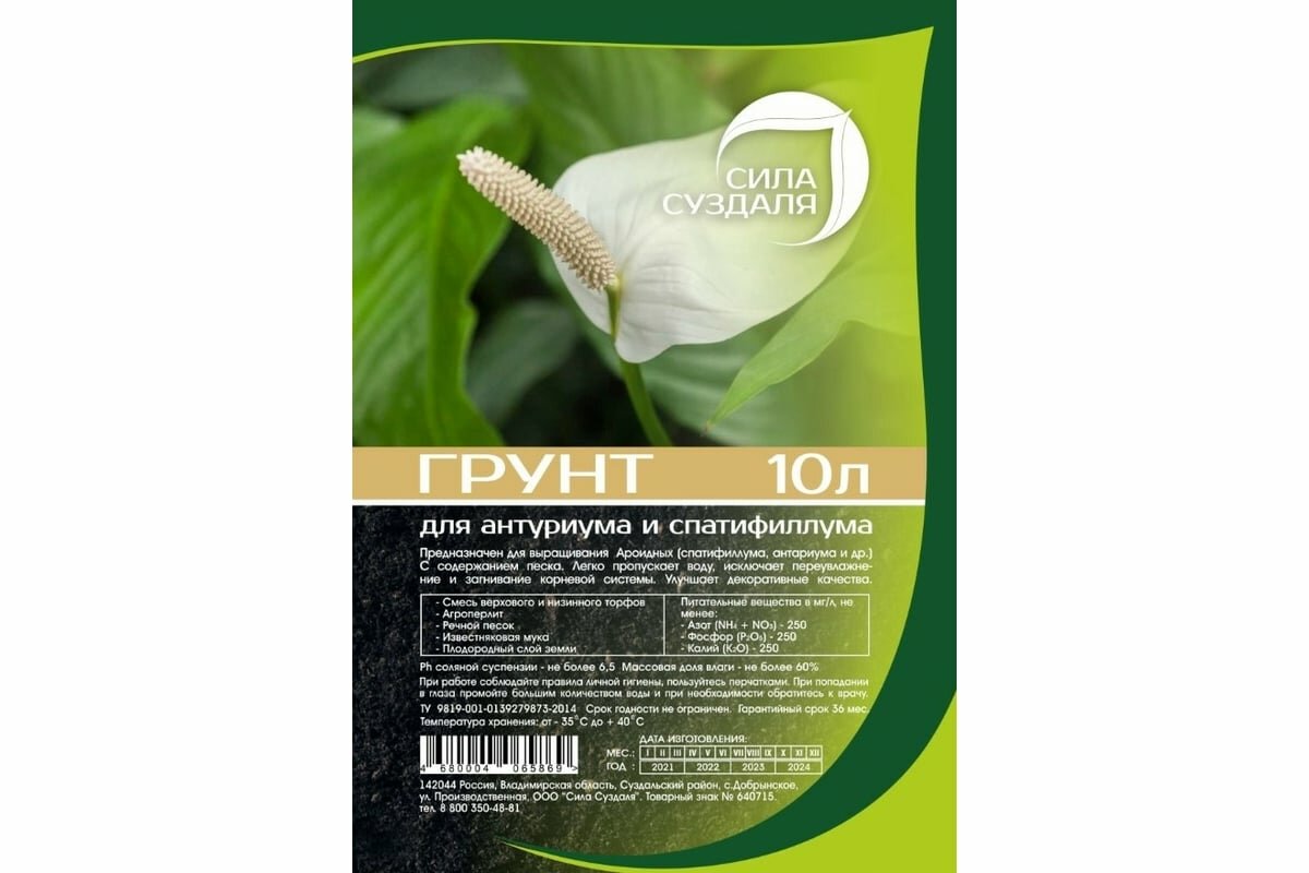 | Состав | Грунт для замиокулькаса, антуриума и спатифиллума, ароидных 5 л Сила Суздаля |