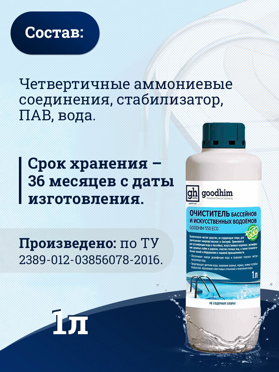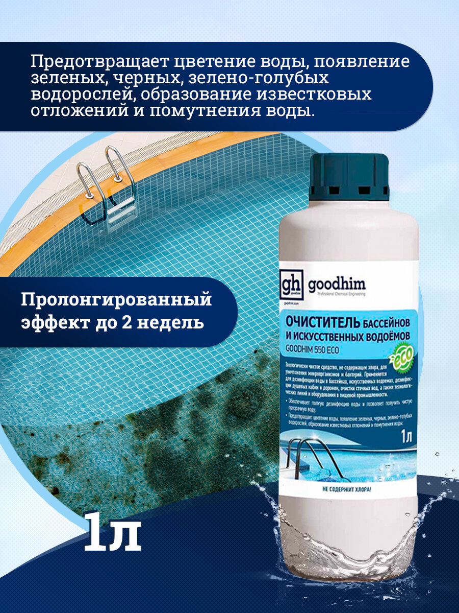 Очиститель бассейнов и искусственных водоемов, GOODHIM 550 ECO без хлора, 1 л. 20441 интересное: