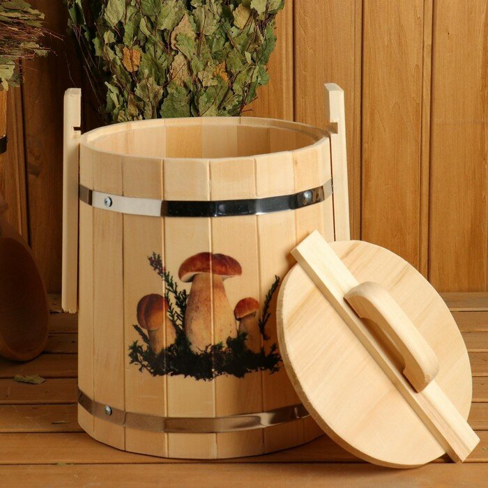 Кадка из липы, 10 л, нержавеющий обруч, с крышкой, с УФ-печатью "Грибочки" "Добропаровъ" интересное: