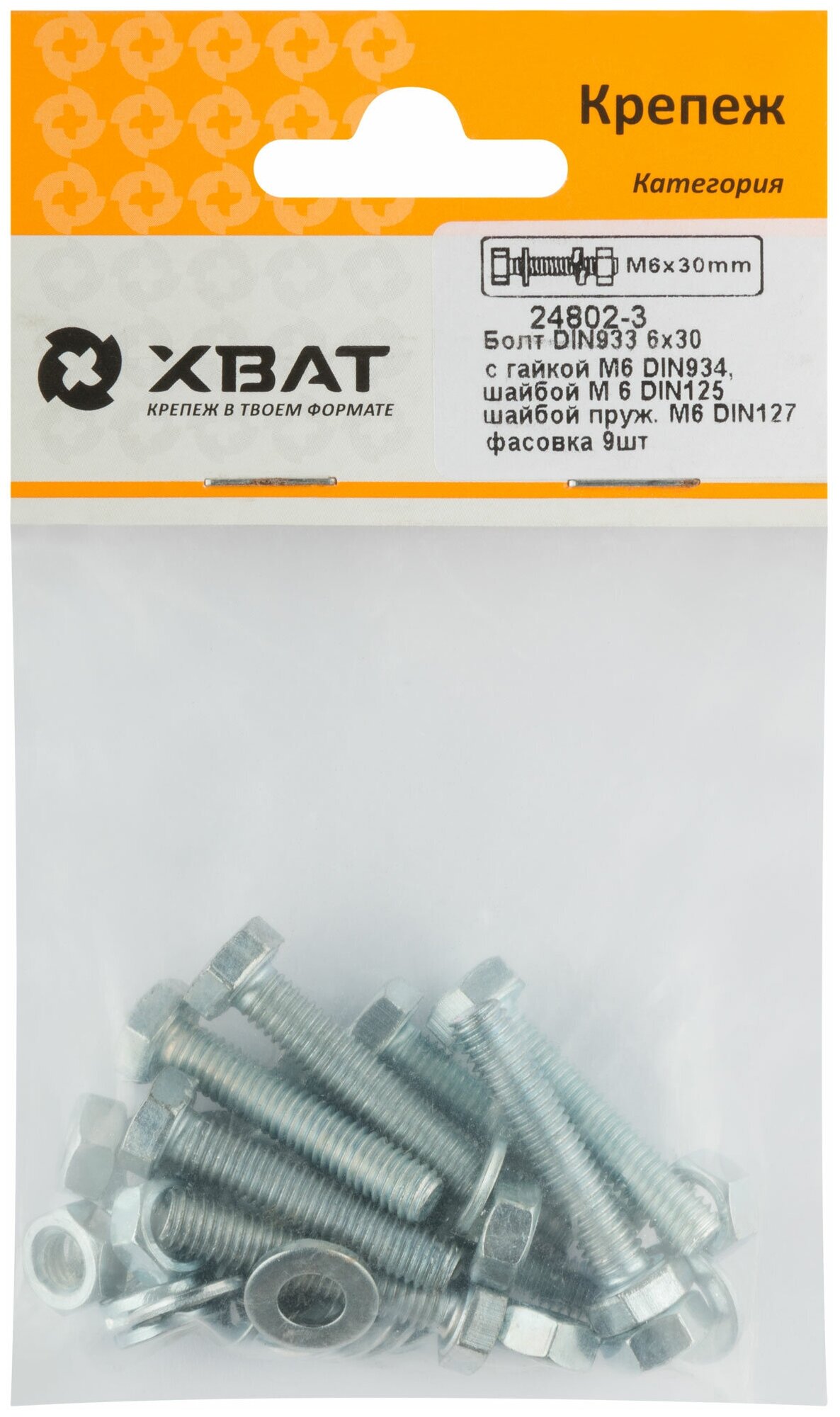 Комплект: Болт DIN933 6х30, с гайкой М6 DIN934, шайбой М 6 DIN125, шайбой пруж. М6 DIN127 (фасовка 9шт.)