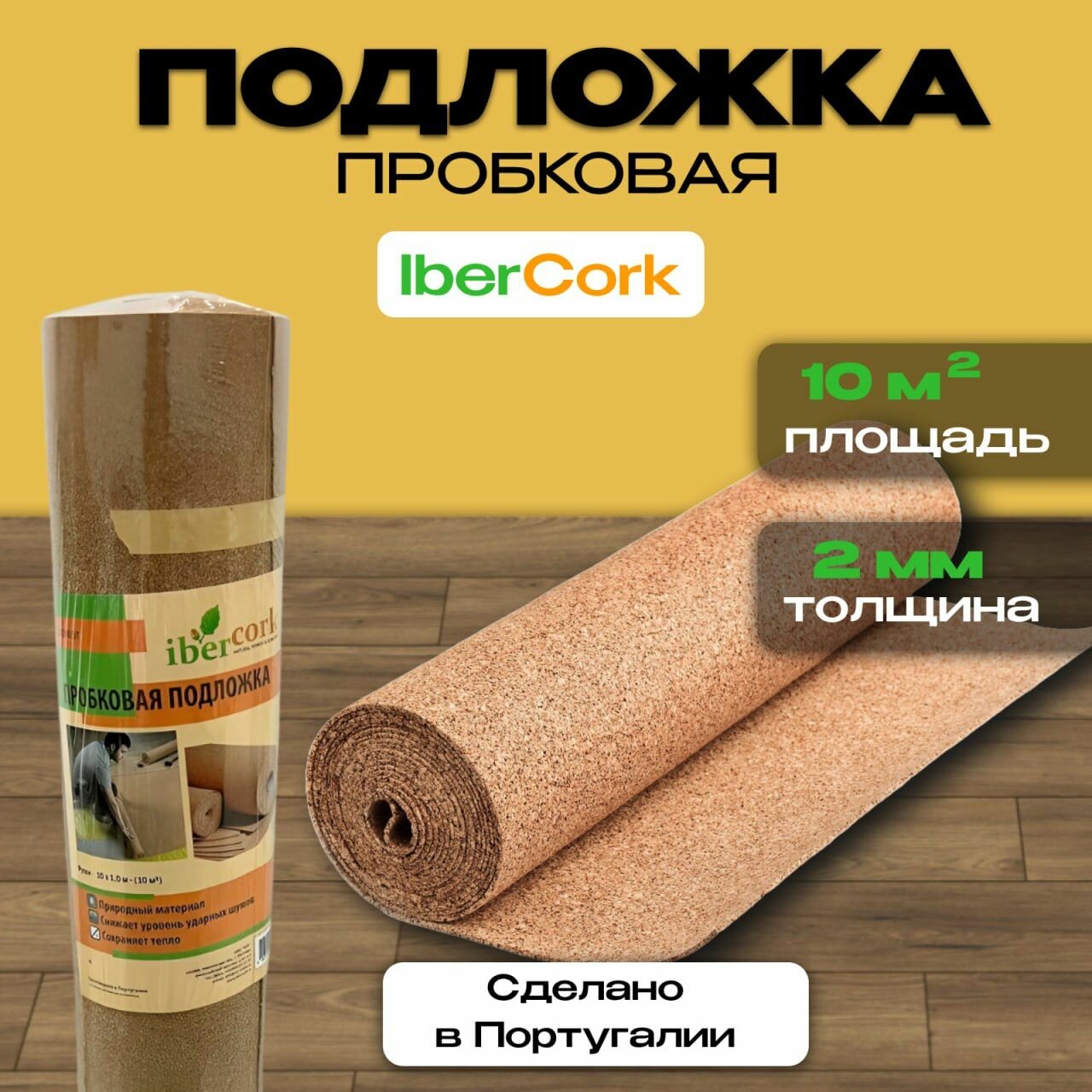 Подложка под паркет и ламинат IBERCORK, пробковый рулон, 1х10м, 2мм, 10кв м, Комплекты от 2 шт.