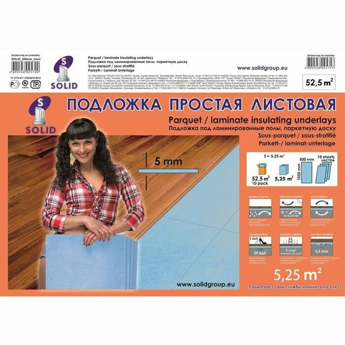 Подложка листовая под ламинат «Солид», синяя, 5 мм/1050×500×5/5.25 м²