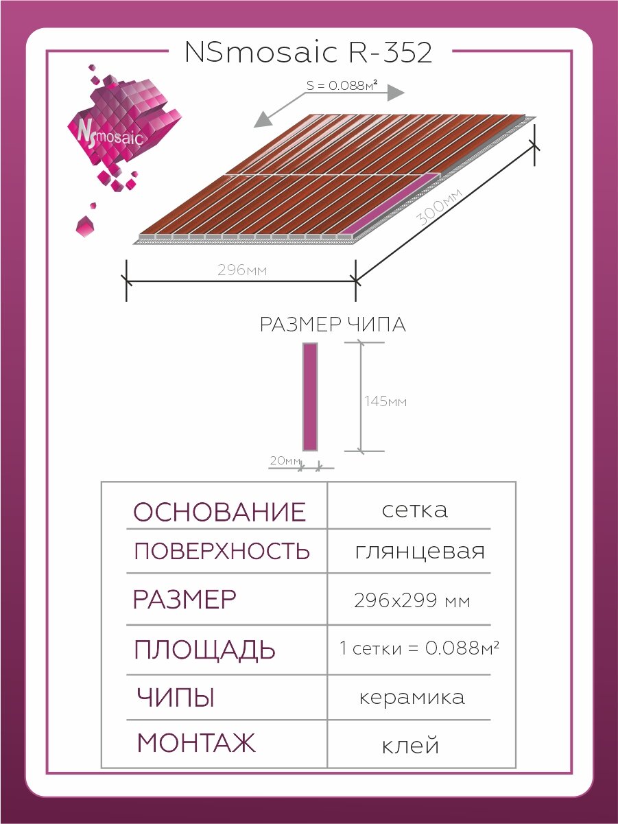 СохранитьМозаика керамическая NS mosaic R-352 296x299 чип 20x145 глянцевая уп 5 шт интересное: