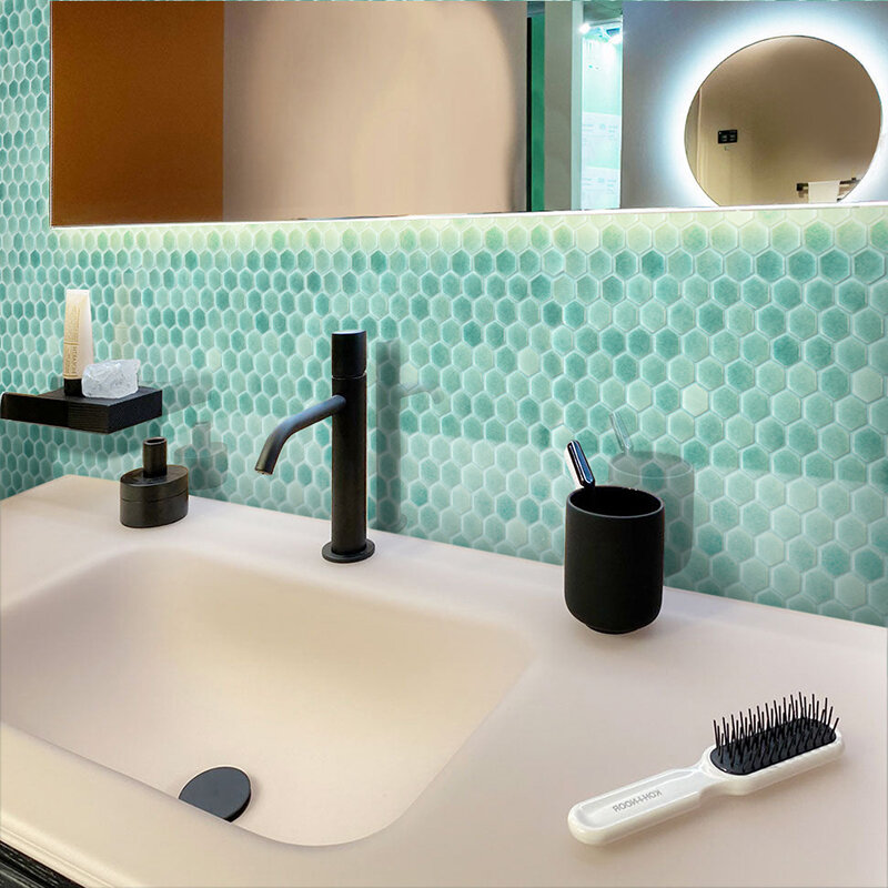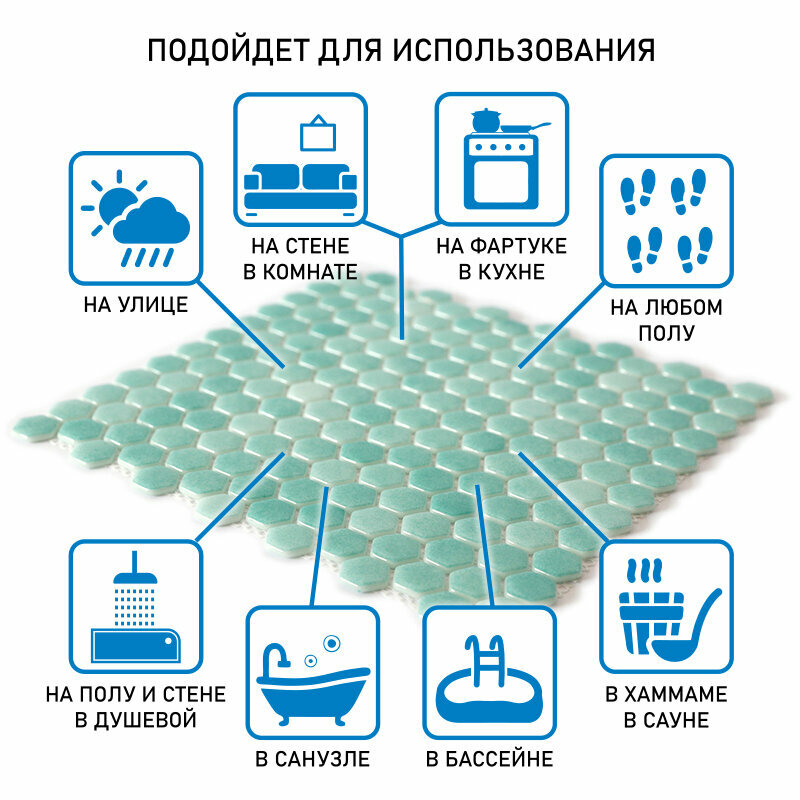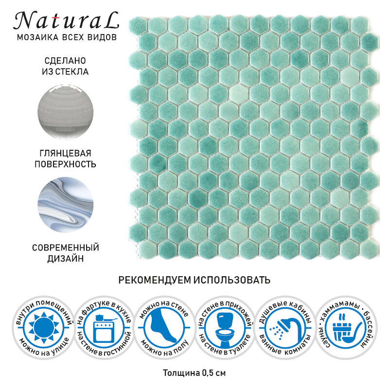 Мозаика Natural STP-GN008-HEX из глянцевого стекла размер 29х29 см чип 2.5 Hexagon мм толщ. 5 мм площадь 0.084 м2 на сетке интересное: